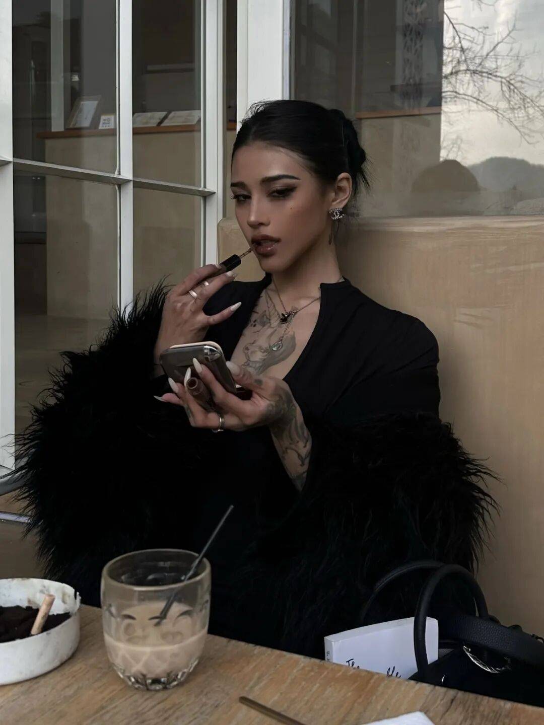 黑、深红、暗紫各种深色为主色调。全身黑是基础款,但绝非单调。这正是“恶女风”色彩的魔力所在。这种美学每一抹颜色都是精心计算的视觉心理战。
