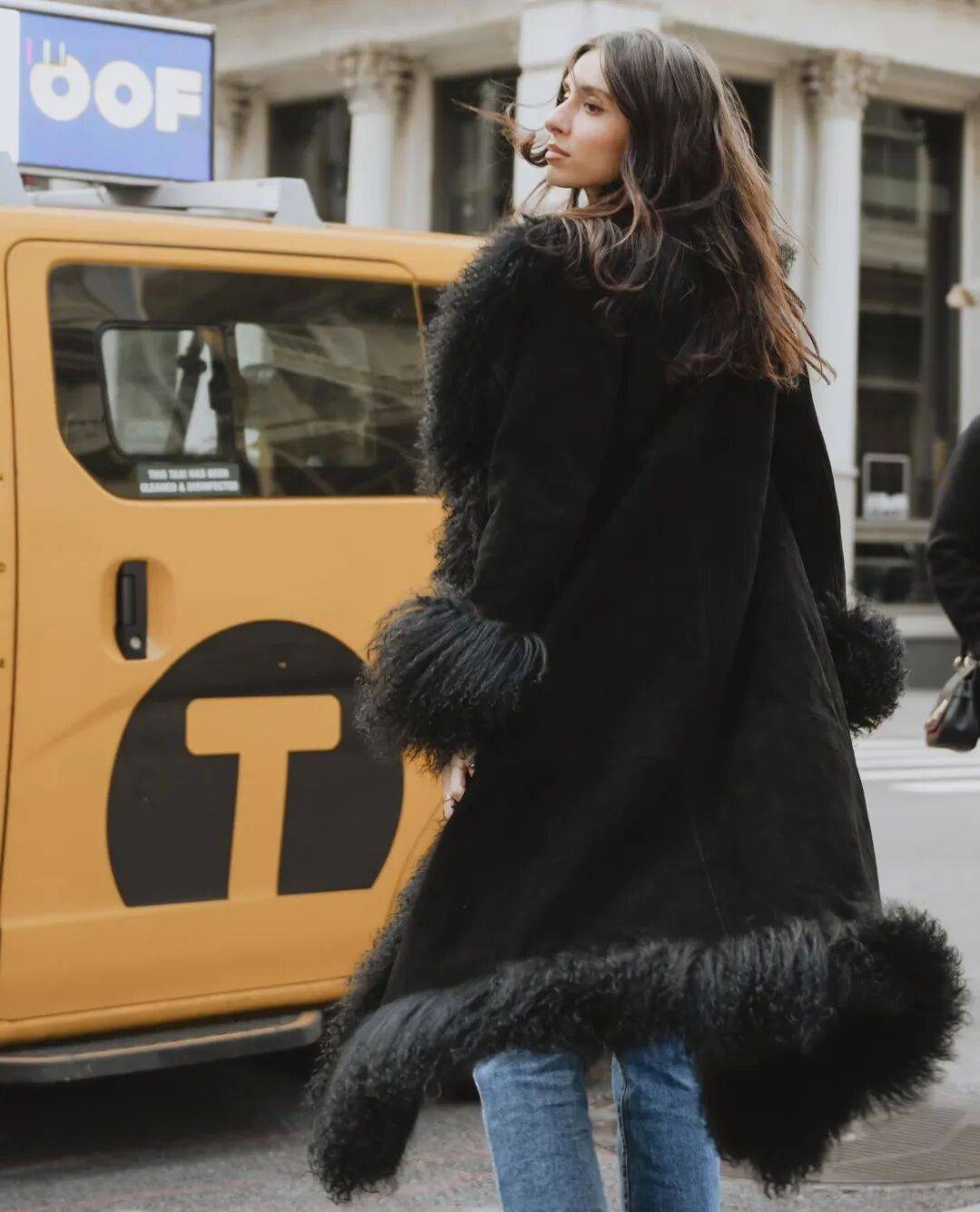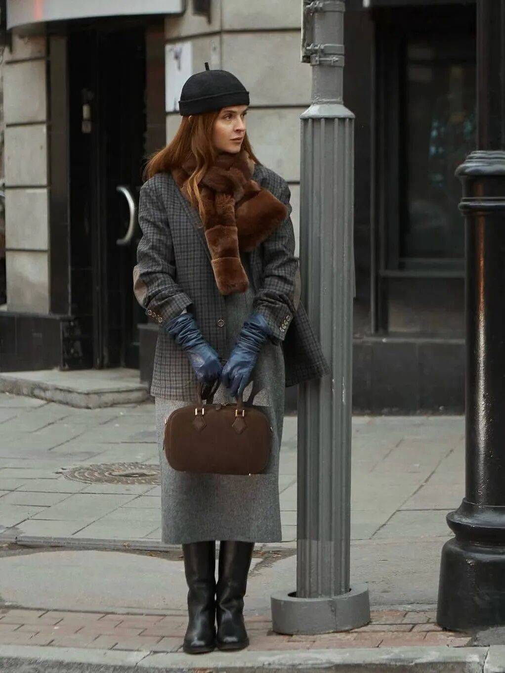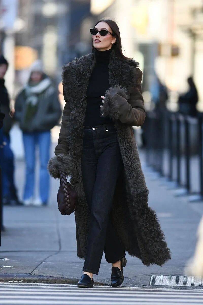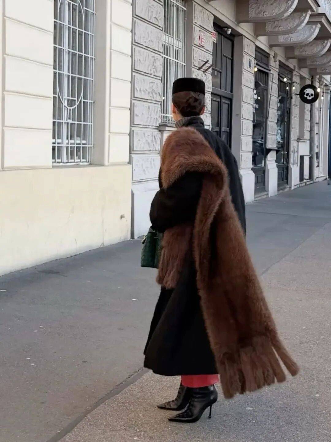 行走间,毛绒随步伐微微颤动,光泽流转,让整体造型在低调与贵气间取得了完美平衡,将上世纪中叶的优雅风华,悄然带入当下街头。