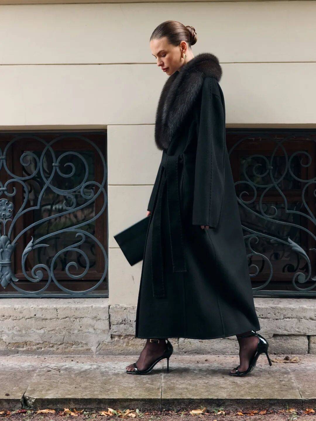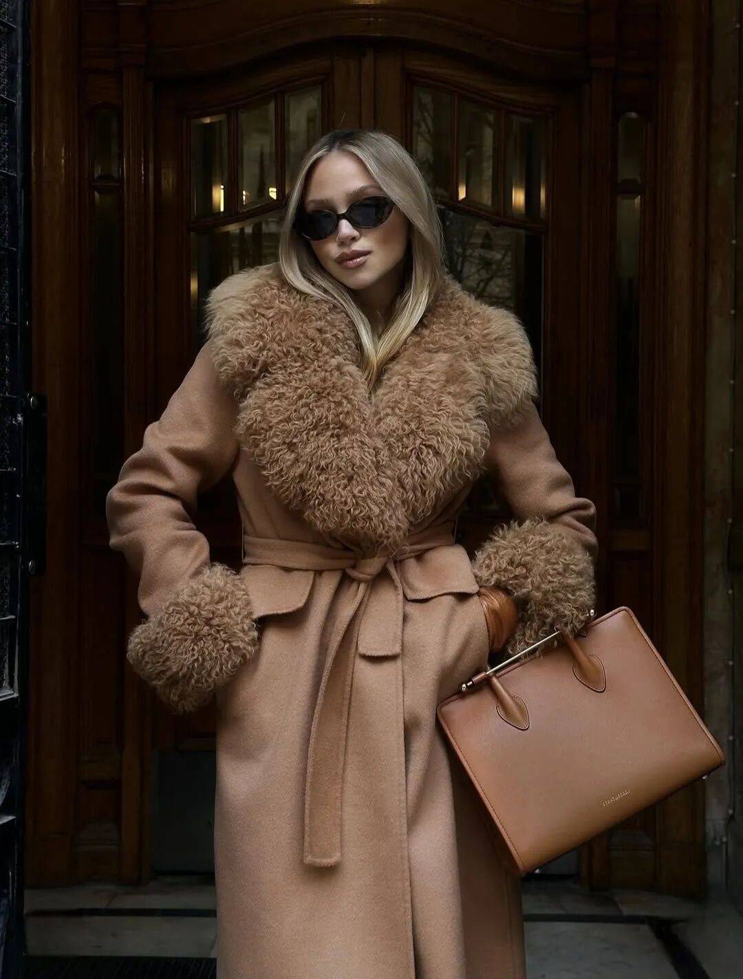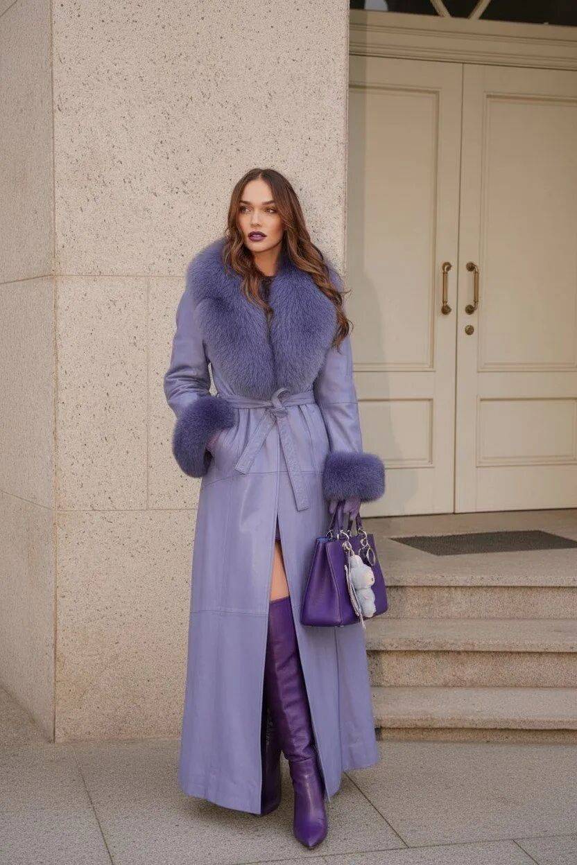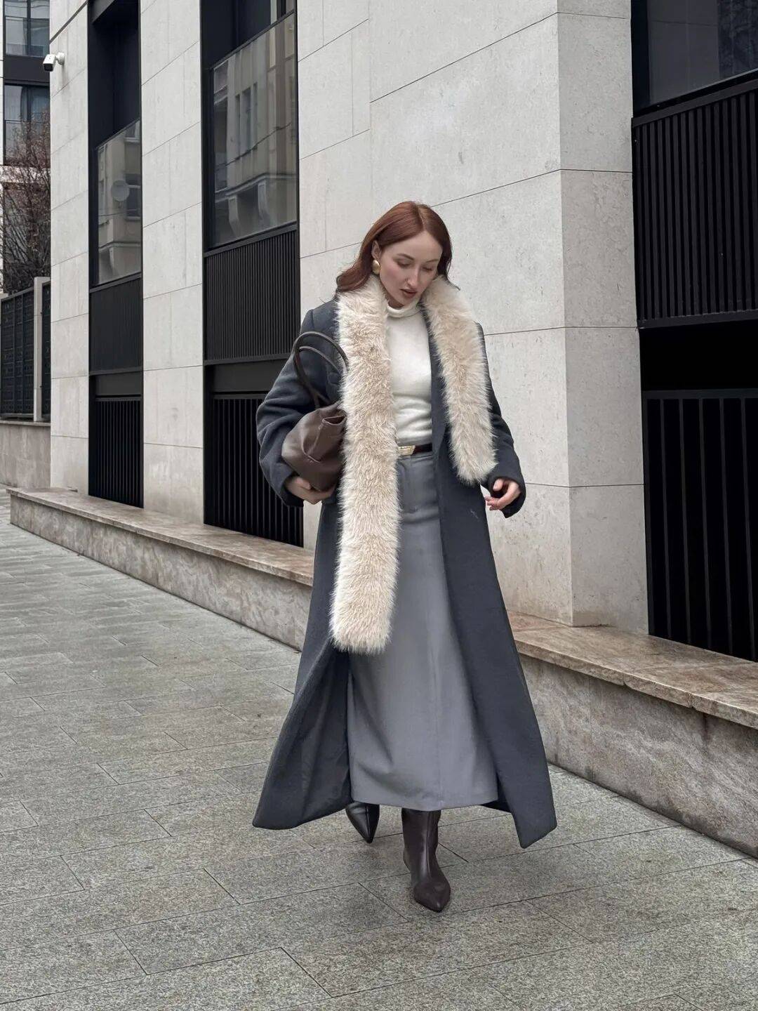 其次,V型皮草领在视觉上形成一道华丽的纵深感,能有效修饰脸型,拉伸颈部线条。当它与一件剪裁精良、尤其是有收腰设计的羊绒或羊毛大衣结合时尤为出众。