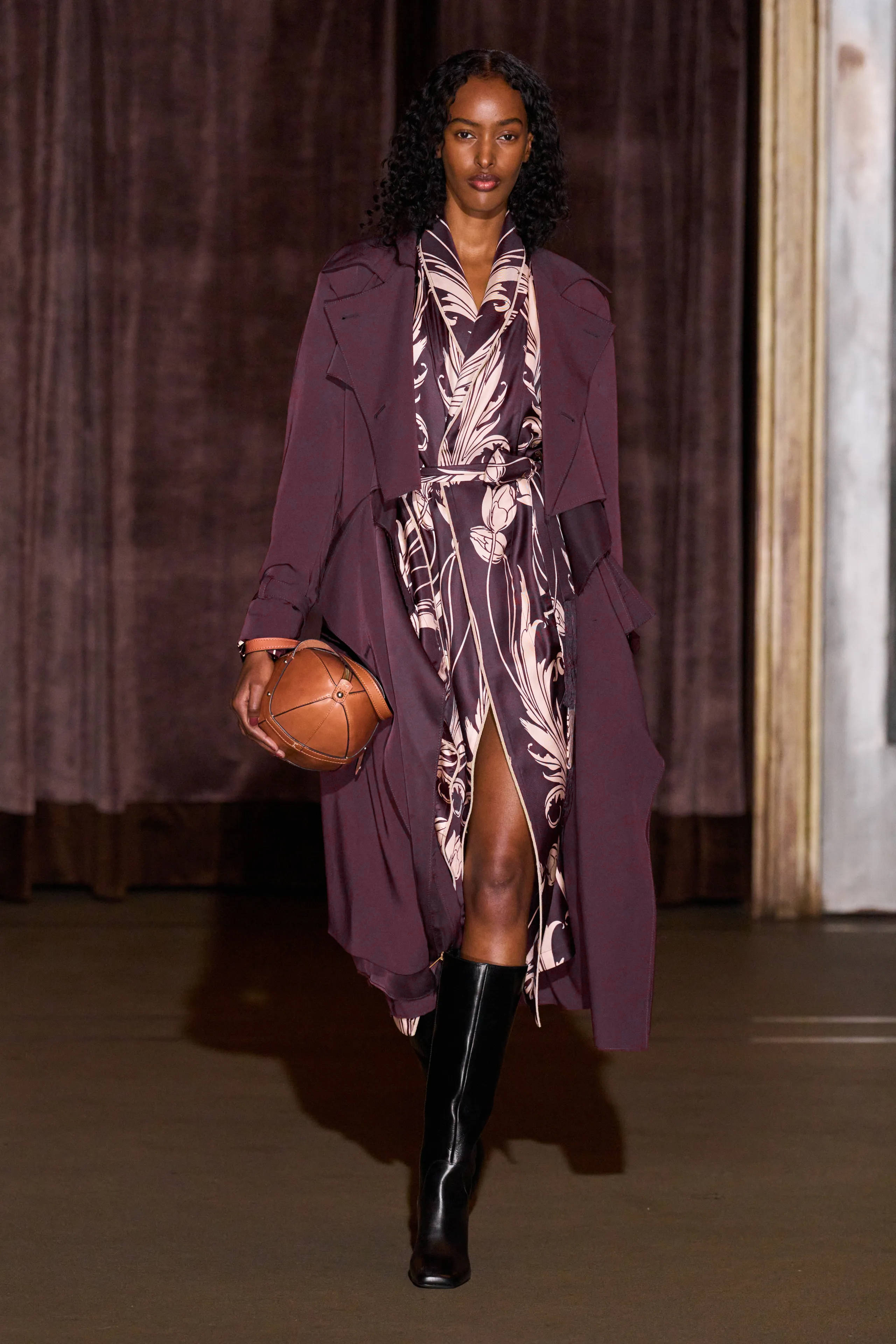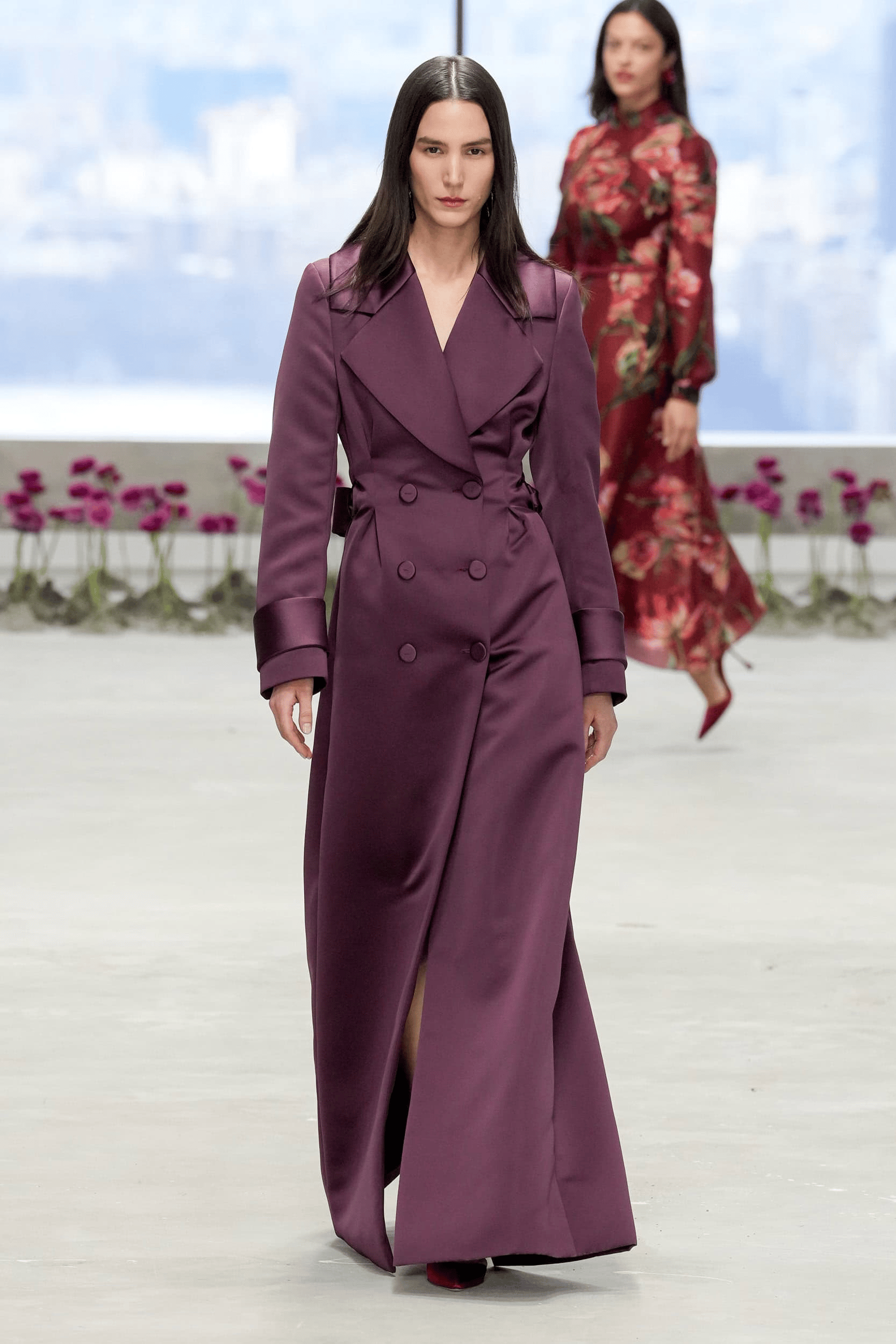 达姆森是一种浓郁的紫色,它带来现代魅力并唤起戏剧性的复古感。Carolina Herrera 2025秋冬系列,模特身着紫色风衣和短裙,散发着高贵与优雅气息。