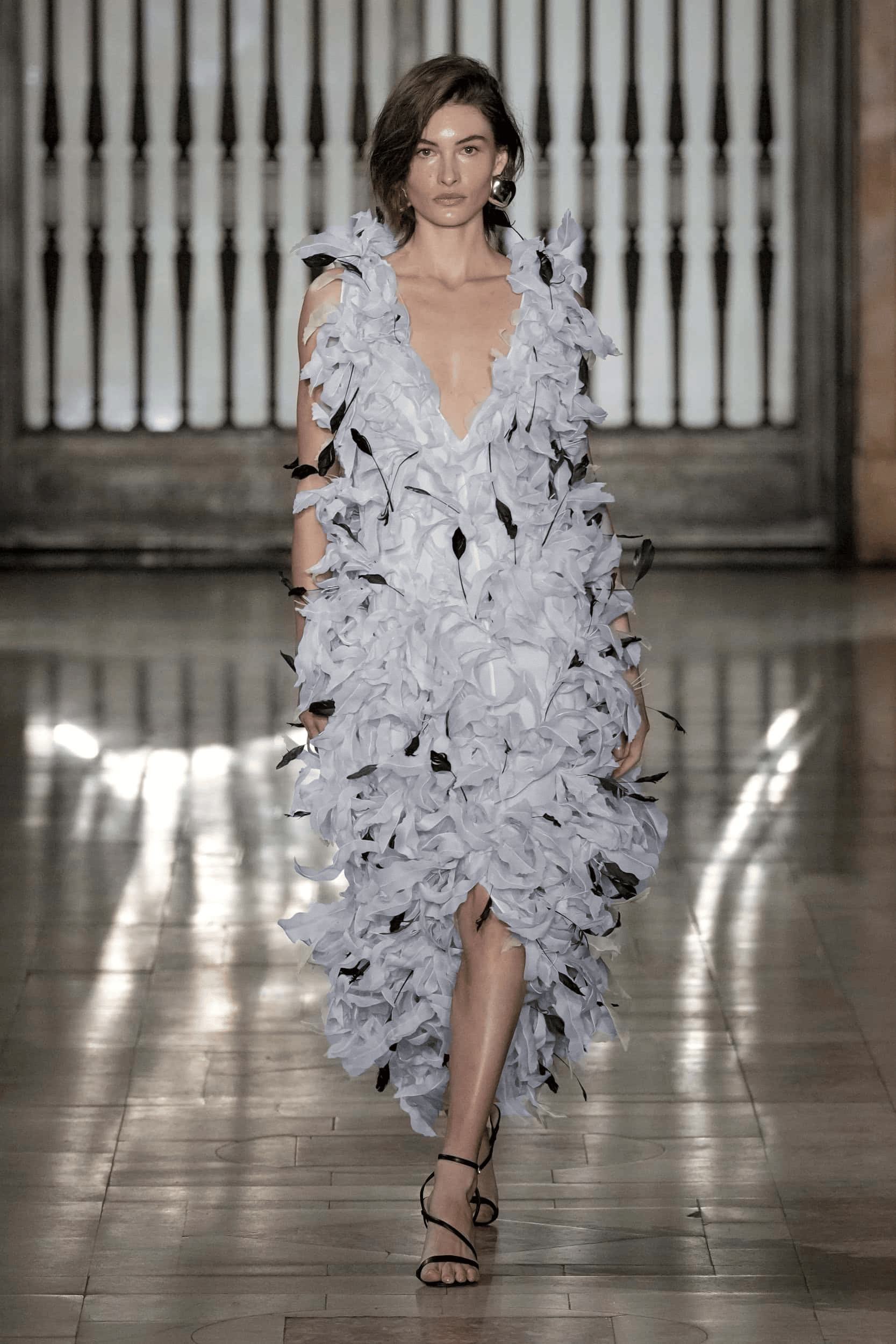 蒸汽蓝是一种朦胧的蓝色,营造出凉爽的感觉。Prabal Gurung 2025 秋冬系列,蒸汽蓝羽毛连衣裙和丝绸连衣裙,轻盈飘逸,灵动优雅。