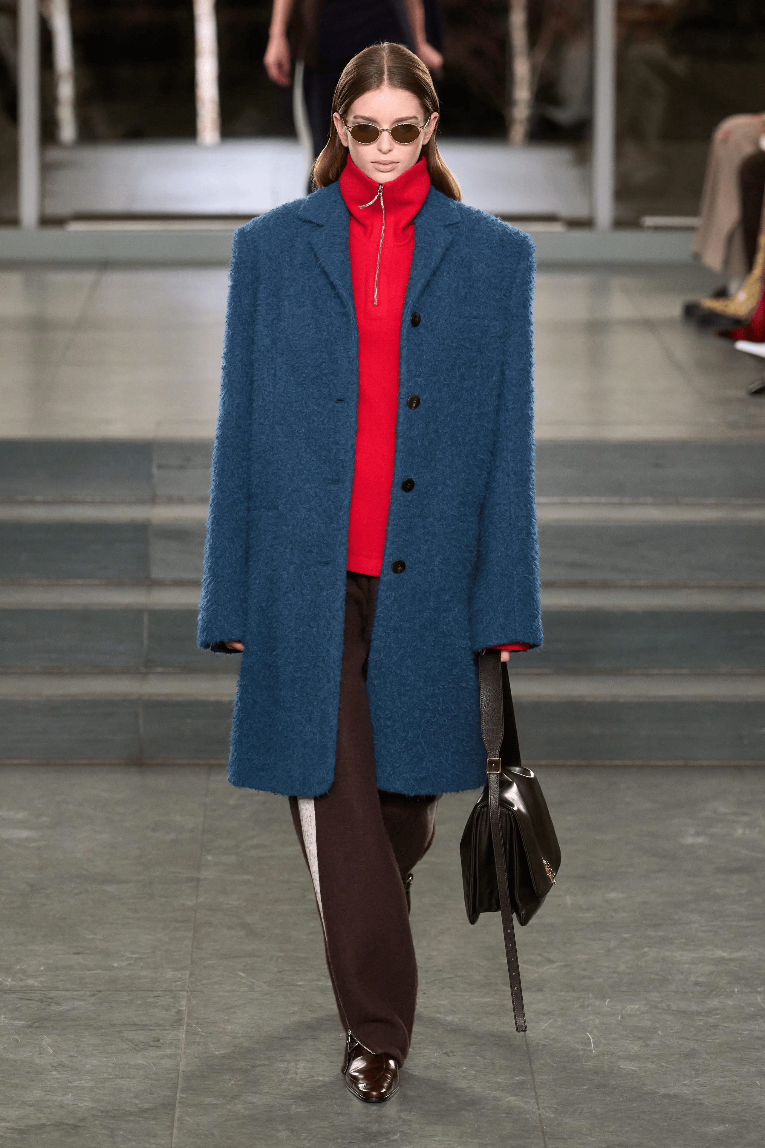 里昂蓝是一种深色的青绿色,Pantone 称其让人联想到“一种让人回忆起过去时代的奢华”。Tory Burch 2025秋冬系列,将这个色调与红色、灰色搭配,既复古又充满高级质感。