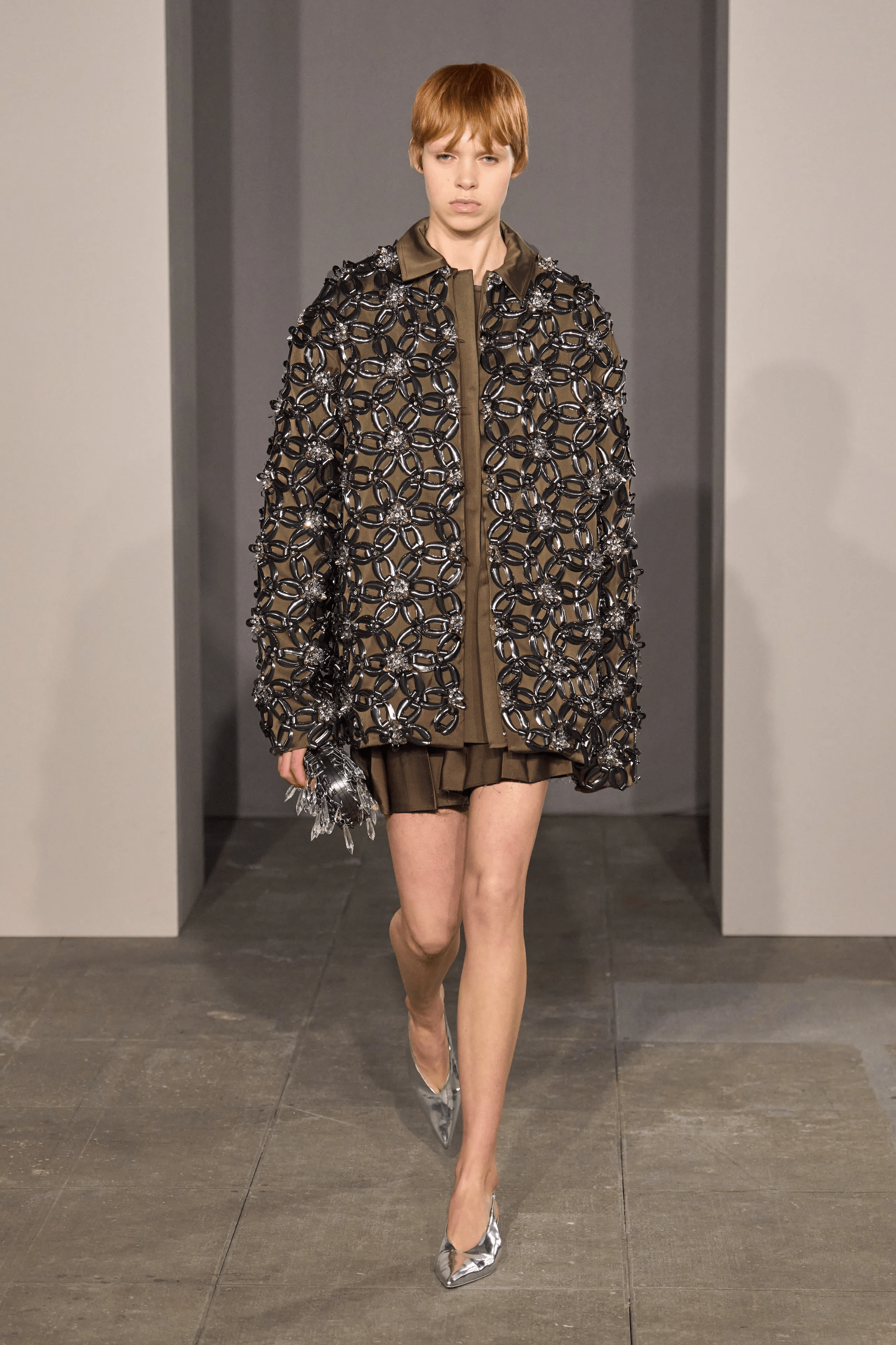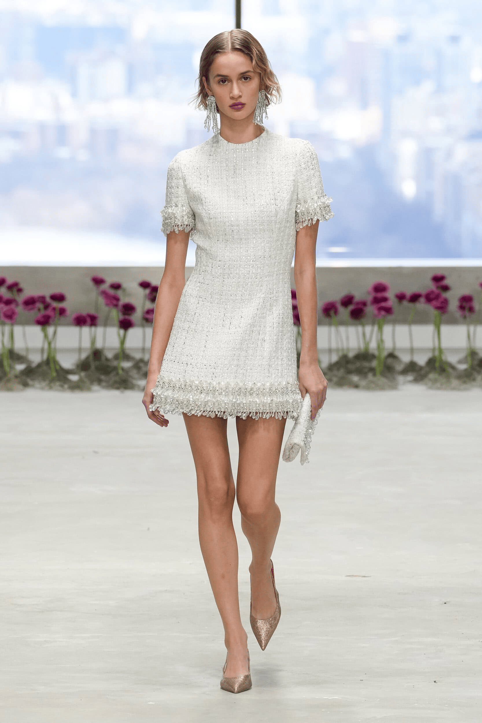 亮白色是一种具有明亮外观的光学白色。Carolina Herrera 2025秋冬系列,亮白色连衣裙融入银色亮片,为整体增添了柔美和细腻,温婉动人。