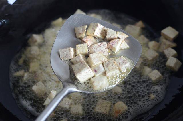 锅里稍微多放点油,将芋头倒入油锅,小火炸至四周呈棕色,大概需要6-8分钟(耐心点)。盛出备用。