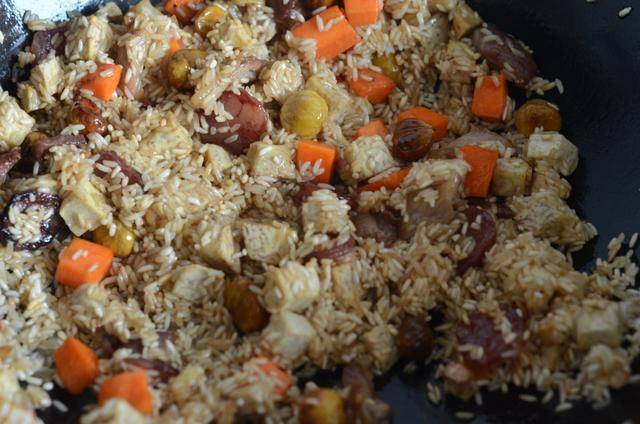 倒入胡萝卜片和板栗,稍微翻炒几下,胡萝卜微微变色。