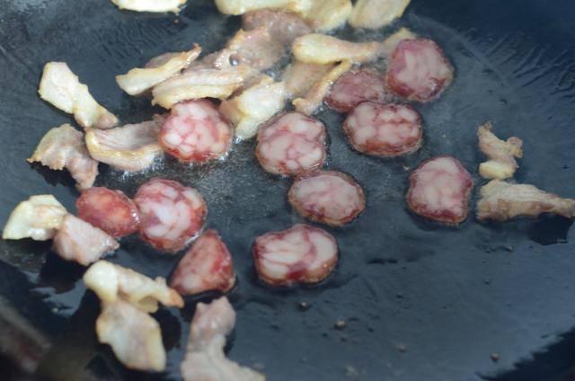 另起油锅,五花肉片倒入锅中,煸炒出油脂,倒入香肠片,微微煸炒出油。