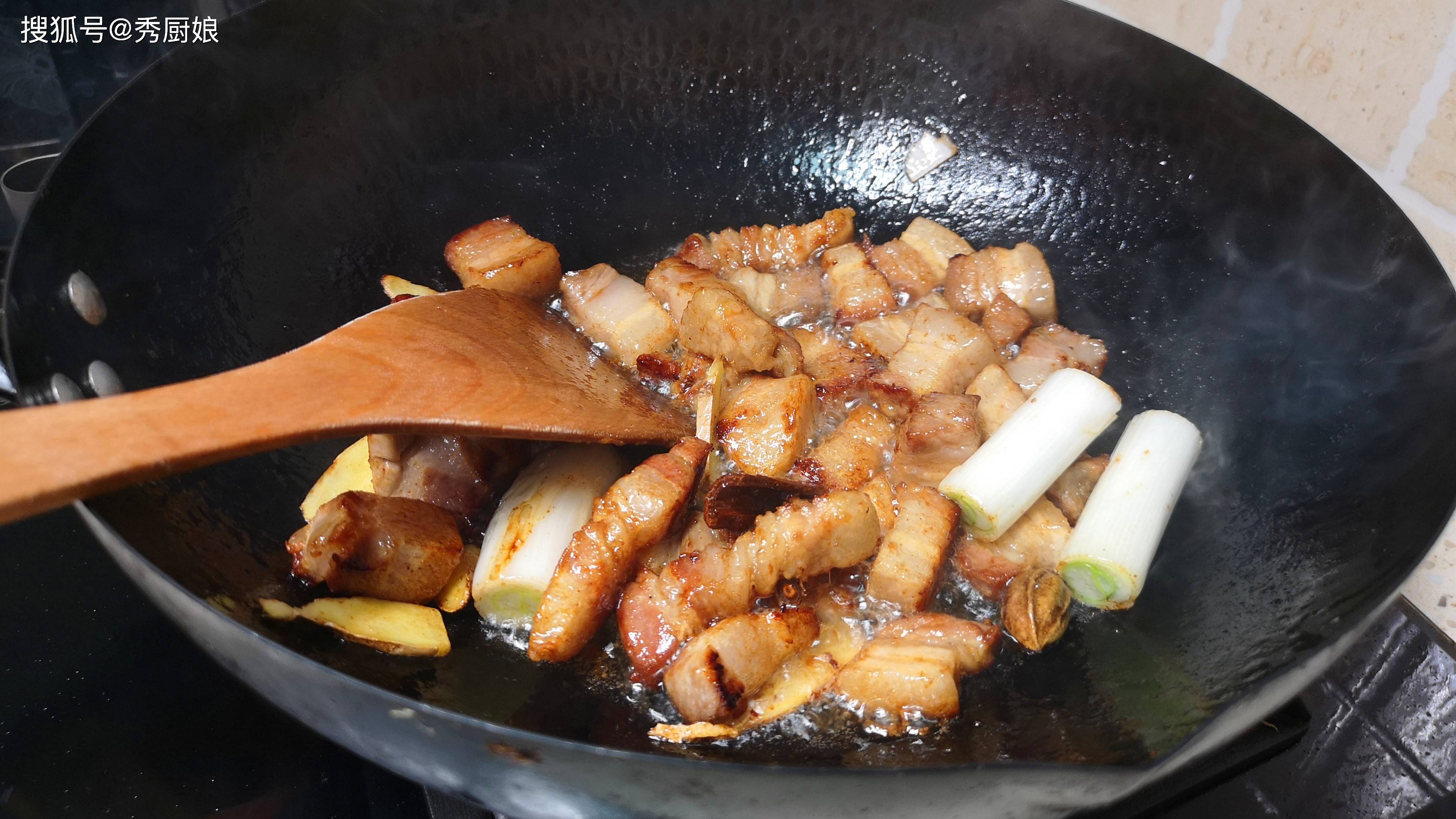 3. 炒糖色(关键步骤!):锅里放少许油,放入冰糖,开小火慢慢熬。看到冰糖融化,变成枣红色,并冒起小泡泡时,迅速倒入焯好水的五花肉块,快速翻炒,让每块肉都均匀地裹上糖色。这样炖出来的肉颜色红亮,特别有食欲。