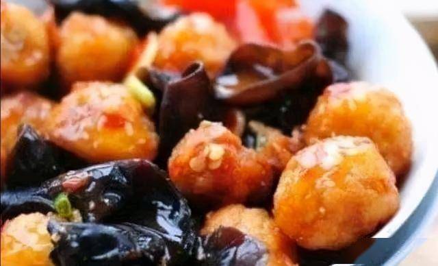 3.锅中留适量油,下入蒜末、泡椒末炒出油红味香;再下入藕丸,加盐、糖醋汁、翻炒匀,加入鲜汤、料酒烧至收浓汤汁,加入盐,水淀粉推匀出锅,撒上葱花,上桌
