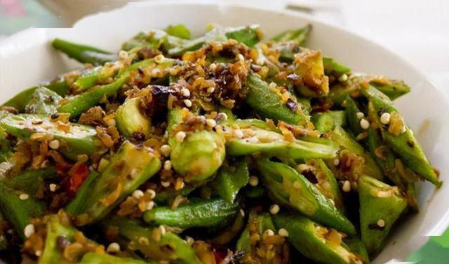 6、锅中留油,下入秋葵、米椒、姜丝、大蒜翻炒断生。