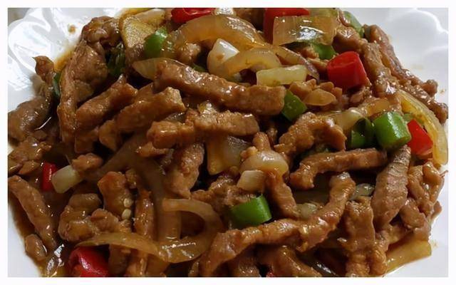 9,锅内留底油下入姜片青红辣椒翻炒爆香,放入肉丝下入洋葱,倒入料汁番号均匀后即可出锅。
