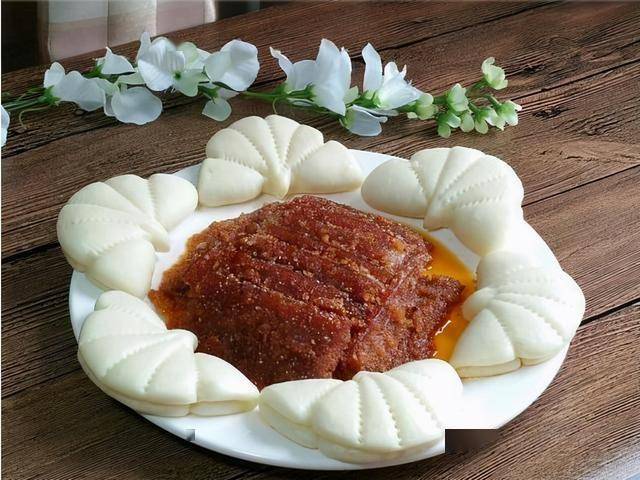 用料五花肉300克;蒸肉米粉100克;调料:料酒、酱油各8克;姜、蒜末、五香粉各适量;腐乳汁、食用油35克10克;郫县豆瓣酱15克;胡椒粉、白糖各少数;荷叶夹资料;普通面粉200克;温水、糖、酵母105克5克2.5克;炼乳7克;猪油5克