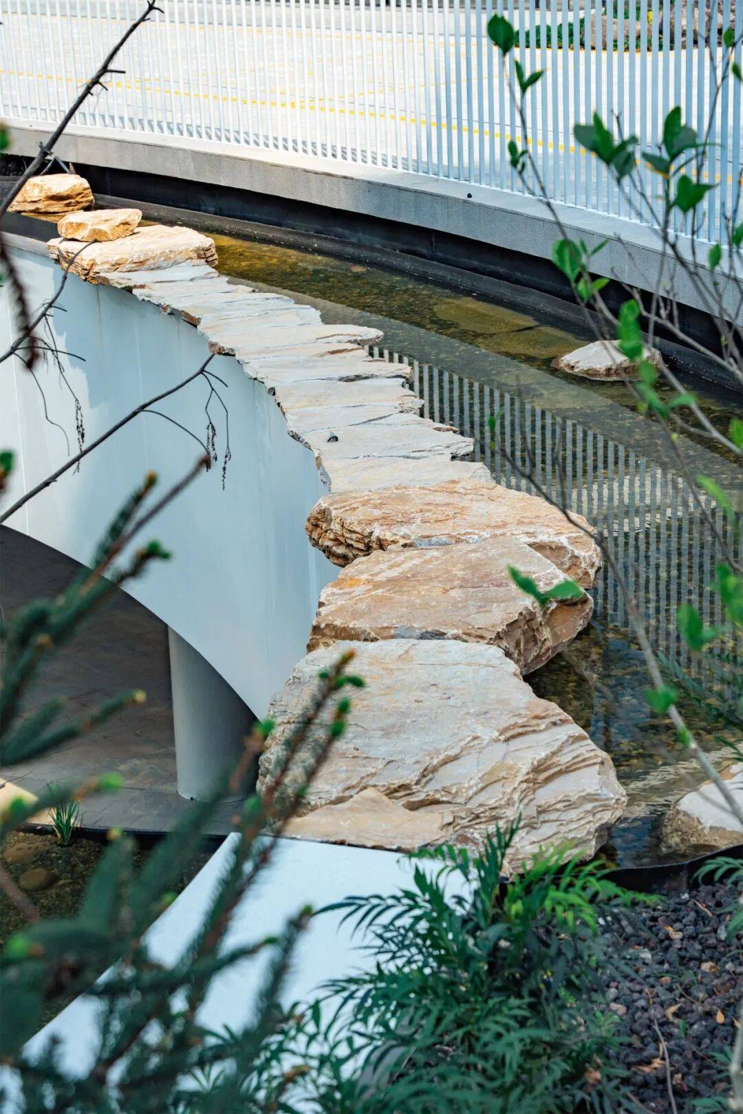 ↑阶梯式观众区为傍晚的使用者提供一个充满活力的舞台 © 栾·摄影 鸟鸣涧:全息感知的山林溪谷 溪流蜿蜒,溯溪而行,鸟影略过山涧,瀑布如碎玉洒落,在溪边赴一场山谷茶席。 天池自首层连桥下方悬挑而出,瀑布顺势倾泻。水口选用自然边缘的木纹石,其表面微起伏与边缘进退扰动水流,形成丰富有机的褶皱形态,赋予水瀑生动质感。