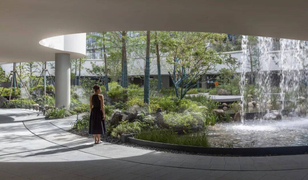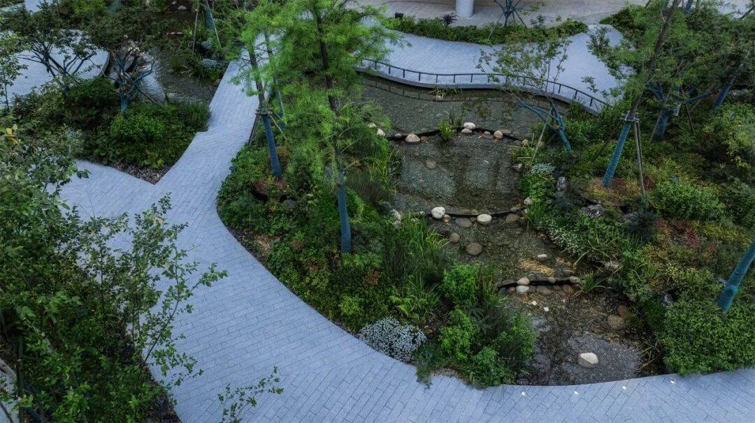 ↑层次丰富的植物营造 © 栾·摄影 高差亦为水景的动态营造带来契机。三段溪流形成12个不同标高的水面,塑造宽窄不一的水帘与流动纹理;挡水石与分水石扰动流速产生褶皱,强化自然动势。池底以30–40mm杂色卵石为底,点缀100–200mm卵石,还原天然河床肌理。 整体设计在空间形态、铺装、植被与景观置石等各层面,皆追求去人工化,以松弛而意趣天成的手法,营造出如置身真实山谷的景观意境。