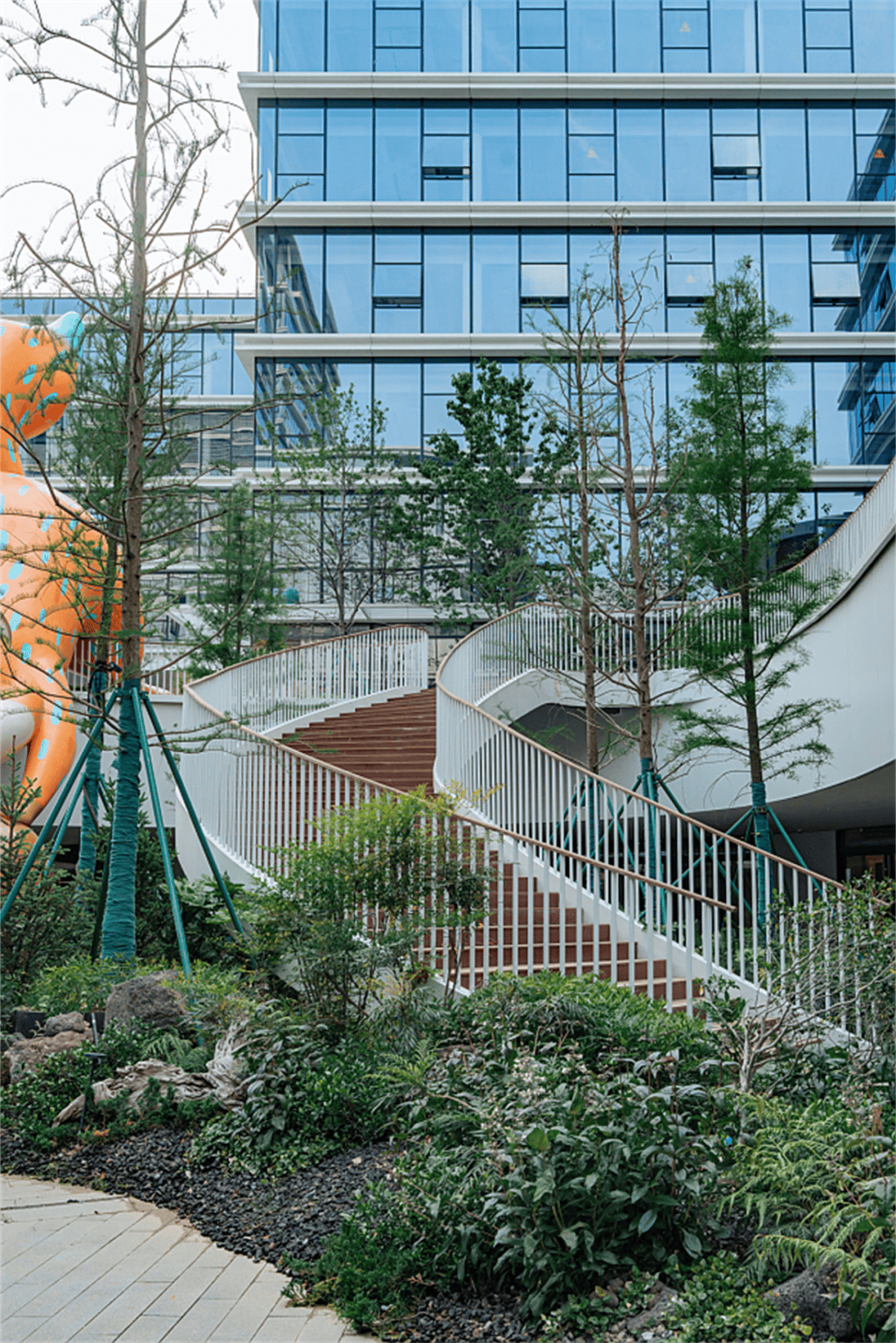 ↑办公空间里的森系生活共享舞台 © 栾·摄影 运营融合:构建功能复合的山谷商业 在自然山谷的空间形态之下,设计充分考虑园区商业和企业活动运营需求。依据业态功能落位,于蜿蜒绿岛之间精准嵌入多处外摆区,有效拓展租赁单元的价值。并通过设置遮阳避雨、夏季降温驱蚊、冬季取暖等环境调节设施,为访客营造四季舒适的消费体验。 步道、广场与草坪均预留了充足的弹性空间,预埋临时用电接口,以支持快闪店、主题市集与大型商业活动的灵活举办。这些设计不仅增强了空间的适应性,更将自然场景转化为可承载多元内容与持续运营的活力界面,实现景观与商业价值的有机共生。