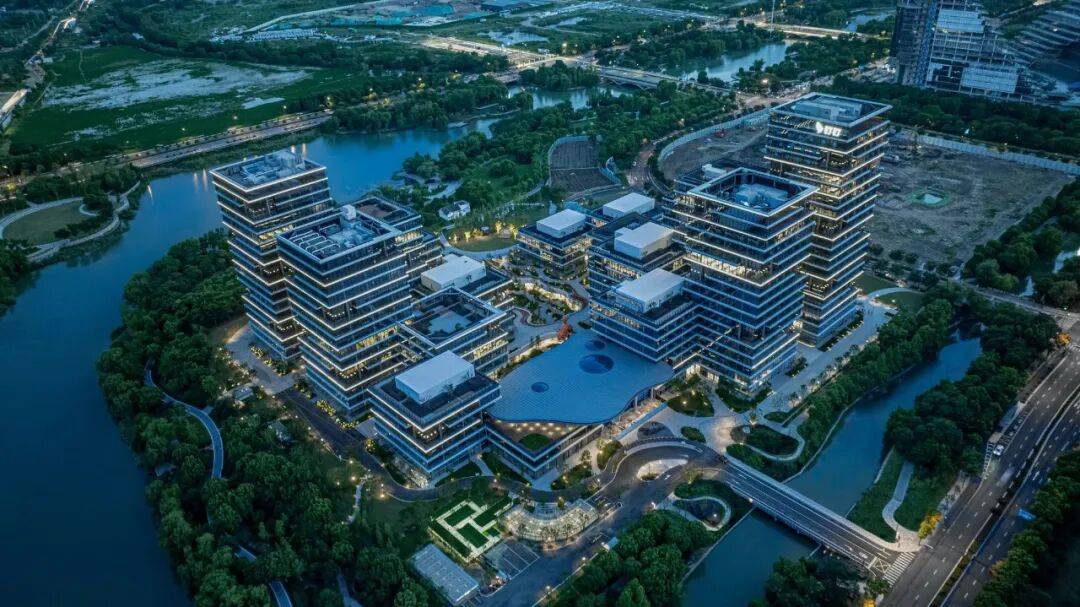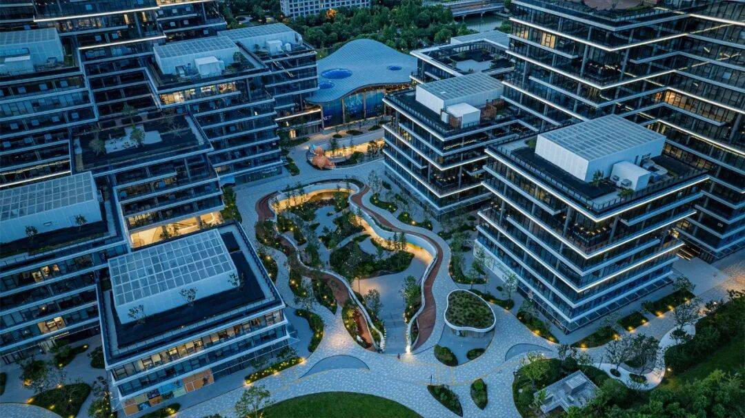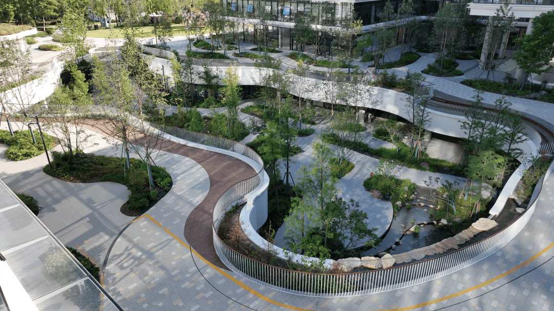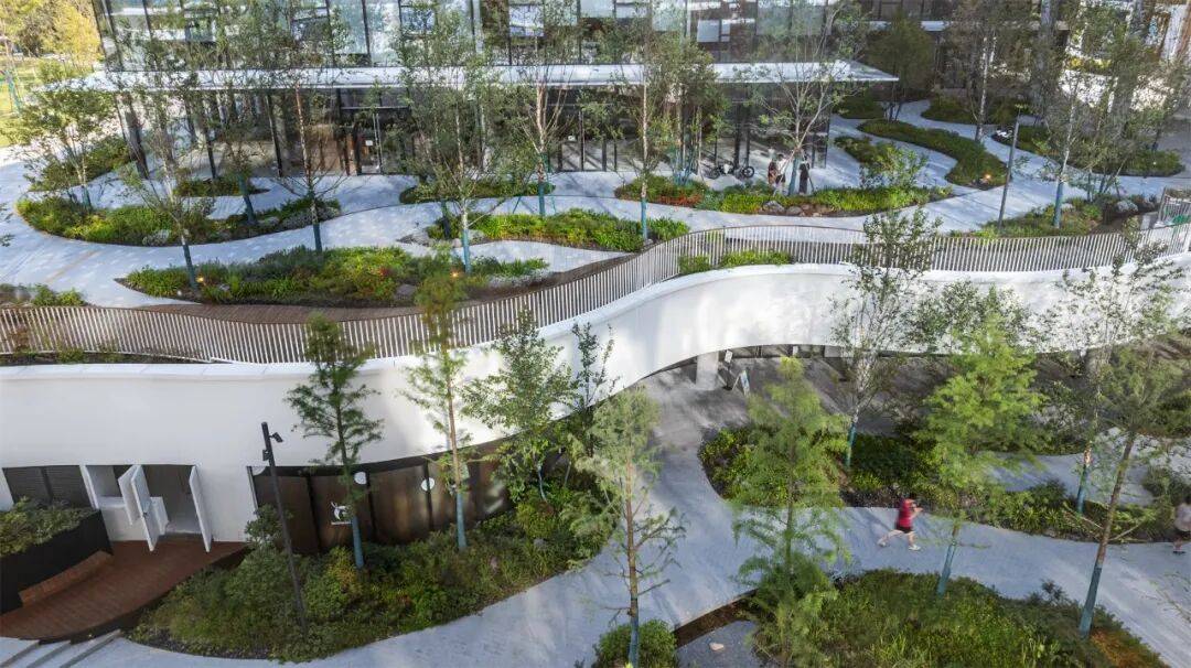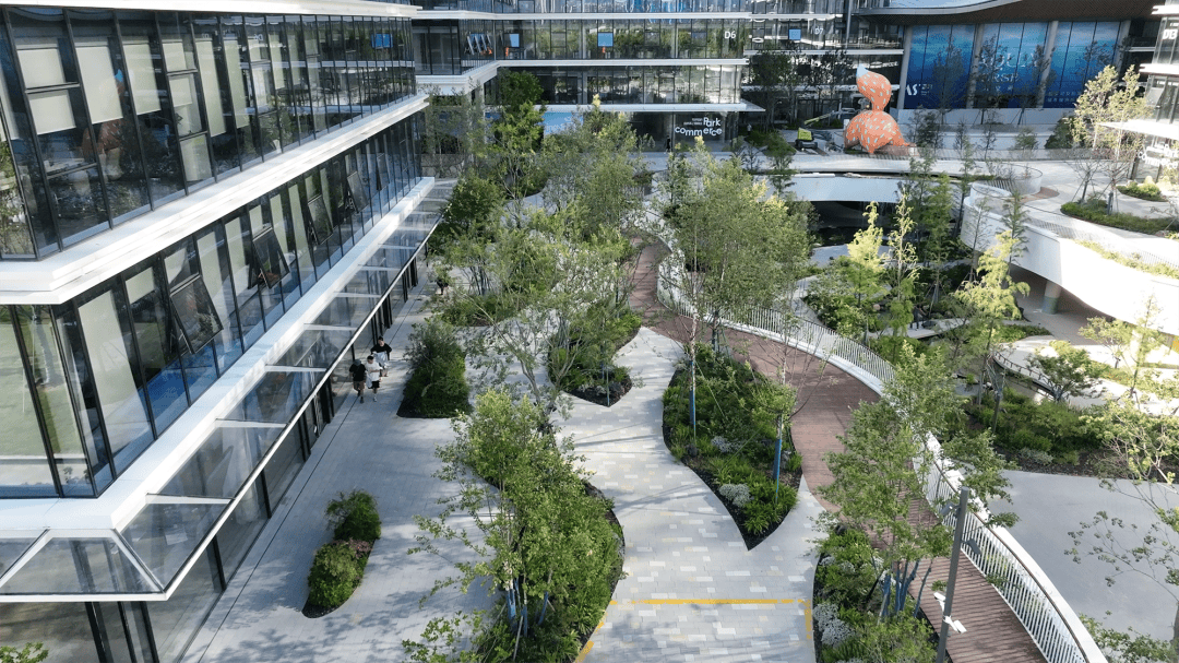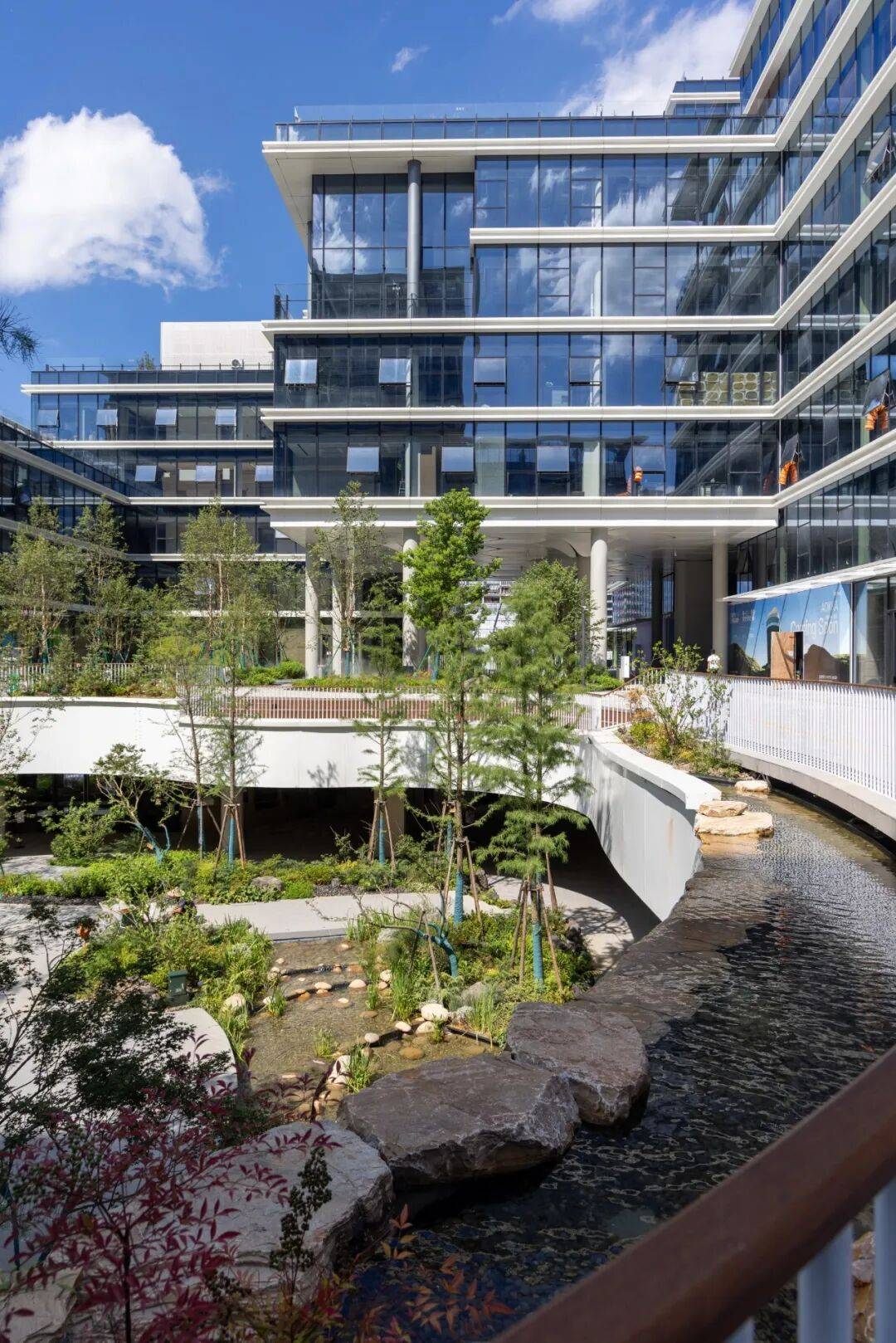 ↑项目与周边环境 © 栾·摄影 项目概况和建筑空间基底 项目坐落于杭州未来科技城核心区,占地约4.8公顷,总建筑面积22万㎡,涵盖1.8万平方米商业空间与13万平方米办公空间,景观设计总面积约5万平方米。作为“世界级活力城市中轴”的启动板块,周边汇聚字节跳动、VIVO、OPPO等众多科技企业总部,形成高密度办公人群与年轻化消费氛围。 秉承绿色、开放与可持续发展理念,建筑布局引入量子社区概念——以30m×30m为基本模块,构建灵活协作的办公单元,沿建筑逐级跌落、面向中央景观花园敞开,充分结合360°全景视野与滨水公园的自然条件,向邻近的阿里公园渗透。建筑在近人区域采用有机曲线,巧妙融入周边自然,为景观营造留下丰富的演绎空间。