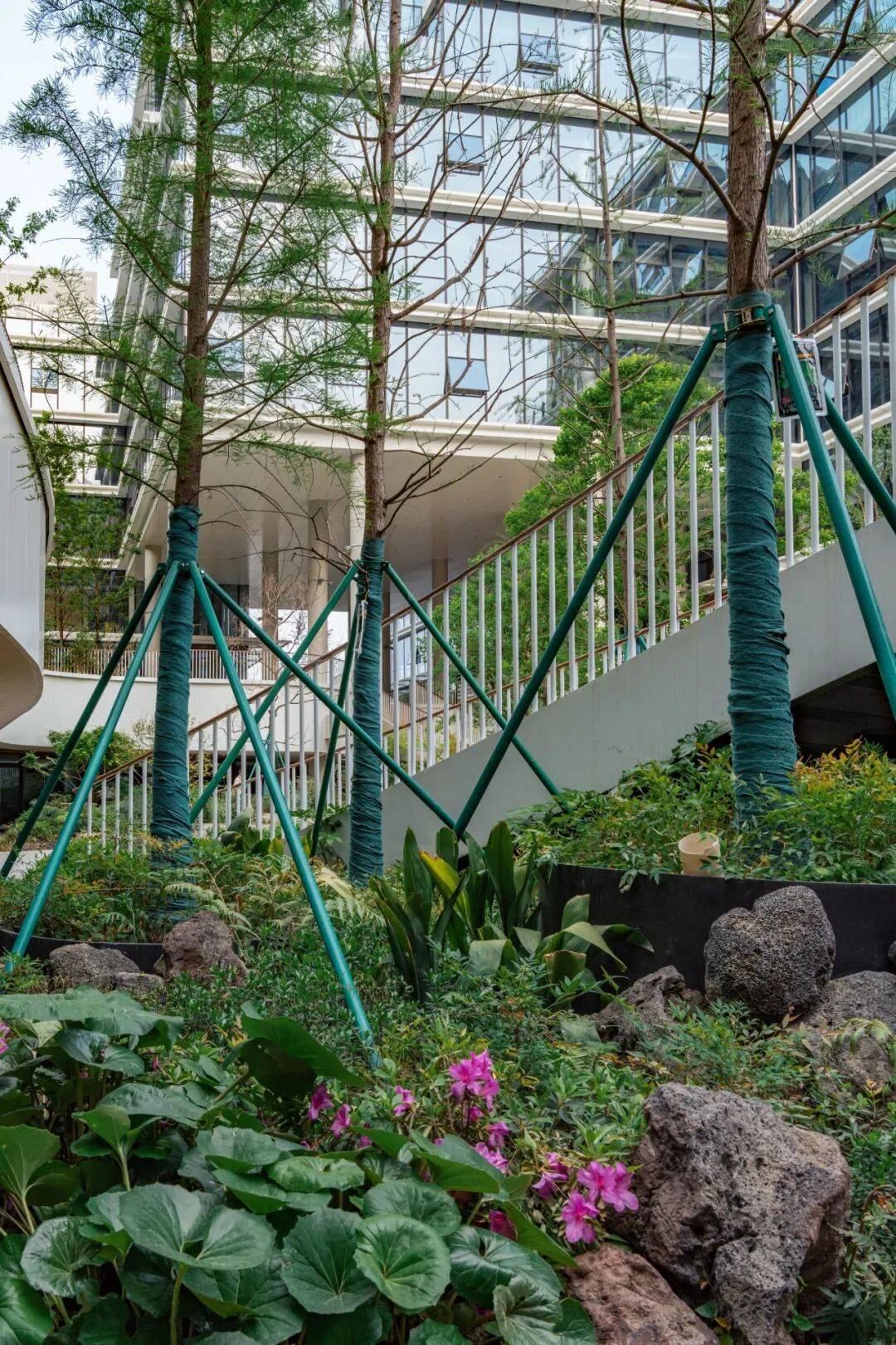 ↑自然流动的功能布局与空间氛围 © 栾·摄影 面对下沉空间覆土仅约400mm的局促挑战,设计通过多维度策略构建溪谷植生环境: • 根据高低视线精准定位大乔木点位,以纤薄钢板围合出必要根系空间,通过微地形将其巧妙消隐 • 在自然放坡不足处,以火山岩结合垂挂植物过渡 • 临路区域立砌火山岩搭配下垂植被,塑造立体生动的溪谷岩层景观 严苛的覆土条件反而催生出丰富的竖向变化。动线、休憩区与外摆空间分布于不同标高,增强视线层次,强化溪谷的沉浸感知。