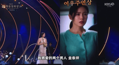 而孙艺珍也在台上说:“想和我爱的两个男人,金泰坪(玄彬原名)以及我们的孩子一起分享获奖的喜悦。”