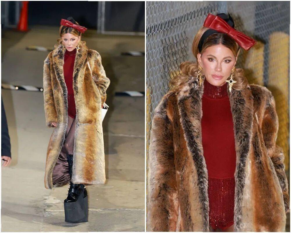 5,《珍珠港》女星Kate Beckinsale上谈话节目,头顶红色大蝴蝶结,脚踩轮胎,没眼看。 看脸的话, 52岁为了冻龄做了很多努力。