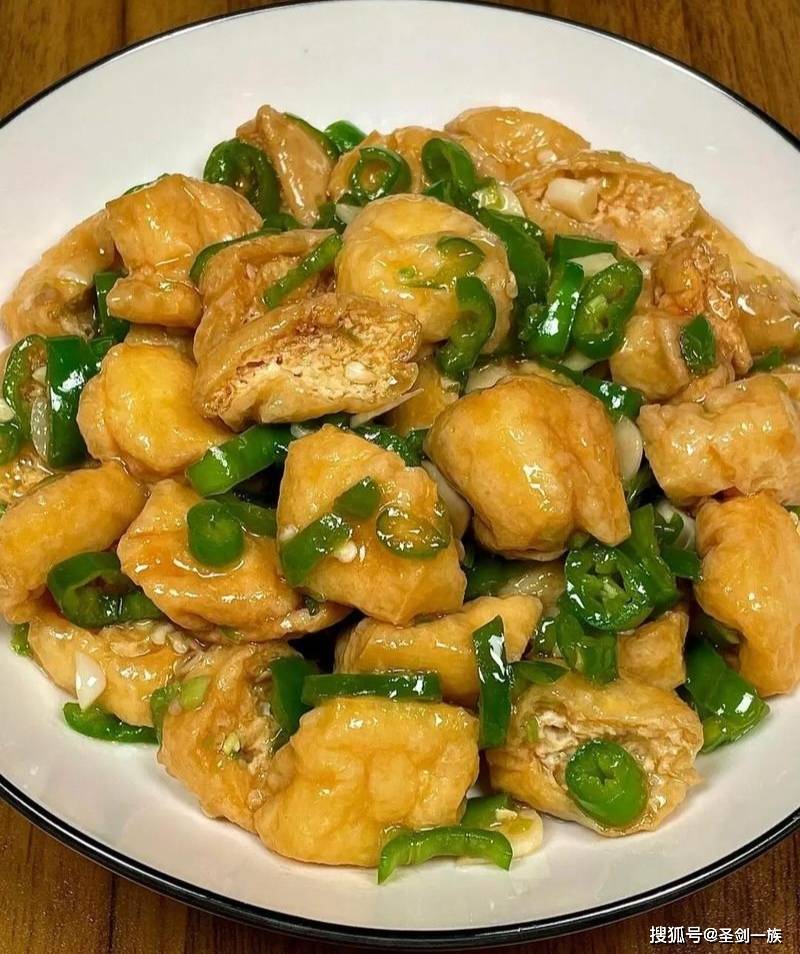 食材: 油豆腐、青椒、蒜蓉、生抽、蚝油、淀粉、鸡精 做法: 1、油豆腐下锅翻炒,加入开水、盐、蚝油焖软,淋入淀粉水,盛出备用 2、油热下青椒、蒜蓉,加入盐调味,倒入油豆腐,加入生抽、鸡精,炒匀即可 五、炝拌木耳秋葵