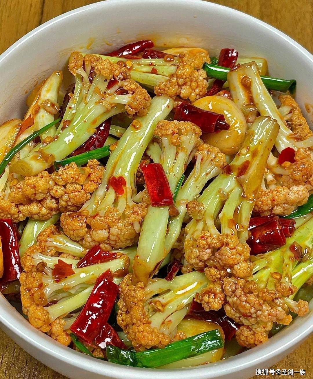 准备:北豆腐1块、包菜叶300克、胡萝卜半根、干木耳5朵(提前泡发)、小米辣1根(不吃辣可不放)、蒜末3瓣、生抽2勺、蚝油1勺、盐少许、糖小半勺、白胡椒粉少许、玉米淀粉1勺加水3勺调成水淀粉、香油几滴、食用油2勺。 做法: 1. 豆腐切成三角形的厚片,在淡盐水里泡5分钟去豆腥味。捞出后,在表面轻轻拍一层薄薄的干淀粉。 2. 平底锅倒油烧热,中火把豆腐片两面都煎成金黄色的硬壳,盛出备用。 3. 包菜用手撕成大片,胡萝卜切片,木耳撕成小朵。提前准备好,炒的时候不慌乱。 4. 热锅爆香蒜末和小米辣,先下胡萝卜和木耳大火炒1分钟,再放入包菜炒软。 5. 把煎好的豆腐轻轻推进锅里,加入生抽、蚝油、糖、盐和白胡椒粉,掂一下锅让味道混合均匀。 6. 沿着锅边淋入小半碗热水,盖上盖子小火焖2分钟,让豆腐饱饱地吸收菜的汤汁。 7. 打开盖子转中火,淋入水淀粉勾个薄芡,让汤汁变浓。最后滴几滴香油提亮,就可以出锅了。这样做的豆腐外韧里嫩,包菜脆甜可口。 三、干锅菜花