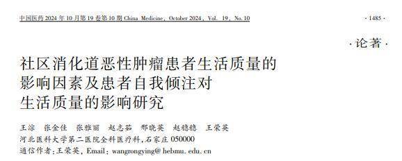 [1]王淙,社区消化道恶性肿瘤患者生活质量的 影响因素及患者自我倾注对生活质量的影响研究,中国医药,2024-10-14