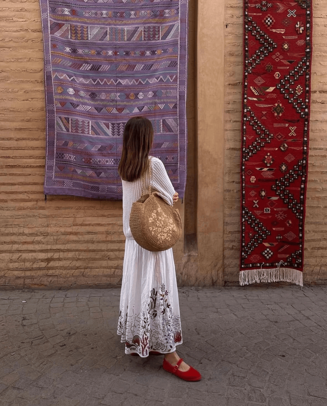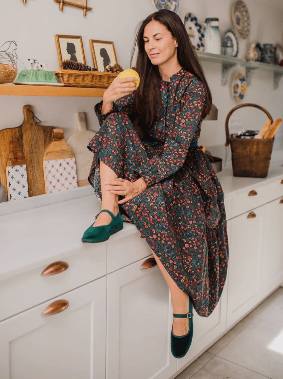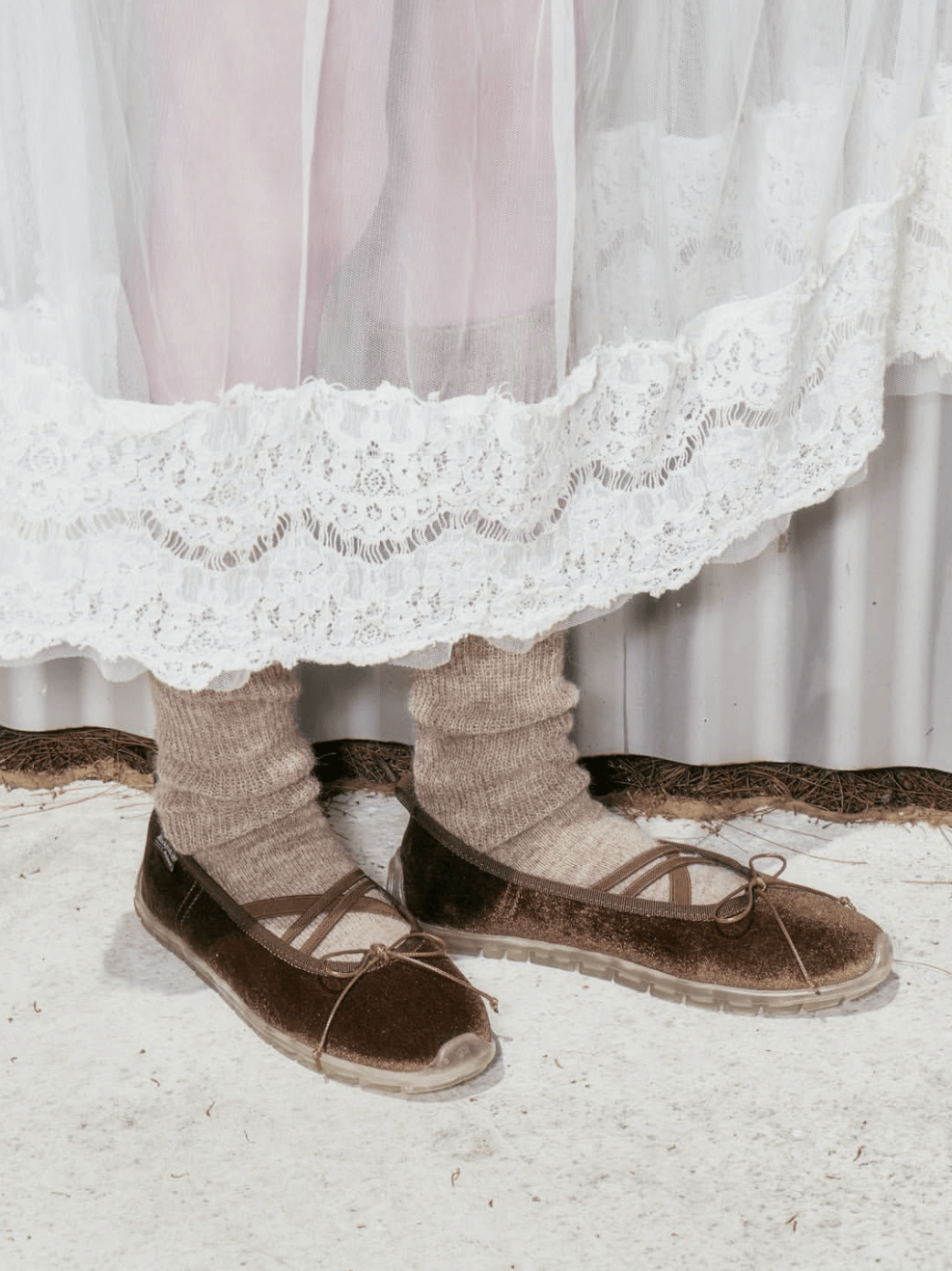 碎花裙、灯芯绒外套、格纹半裙、奶油色针织衫,这些带着复古气息的单品,都能与丝绒鞋自然契合。