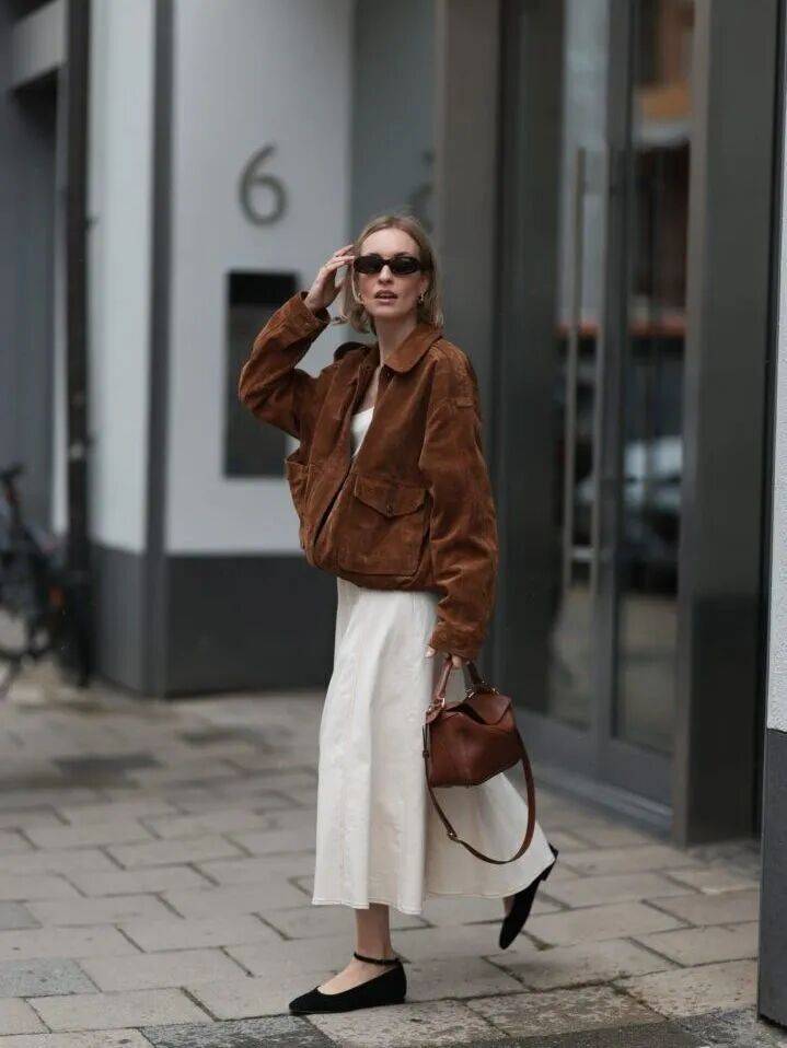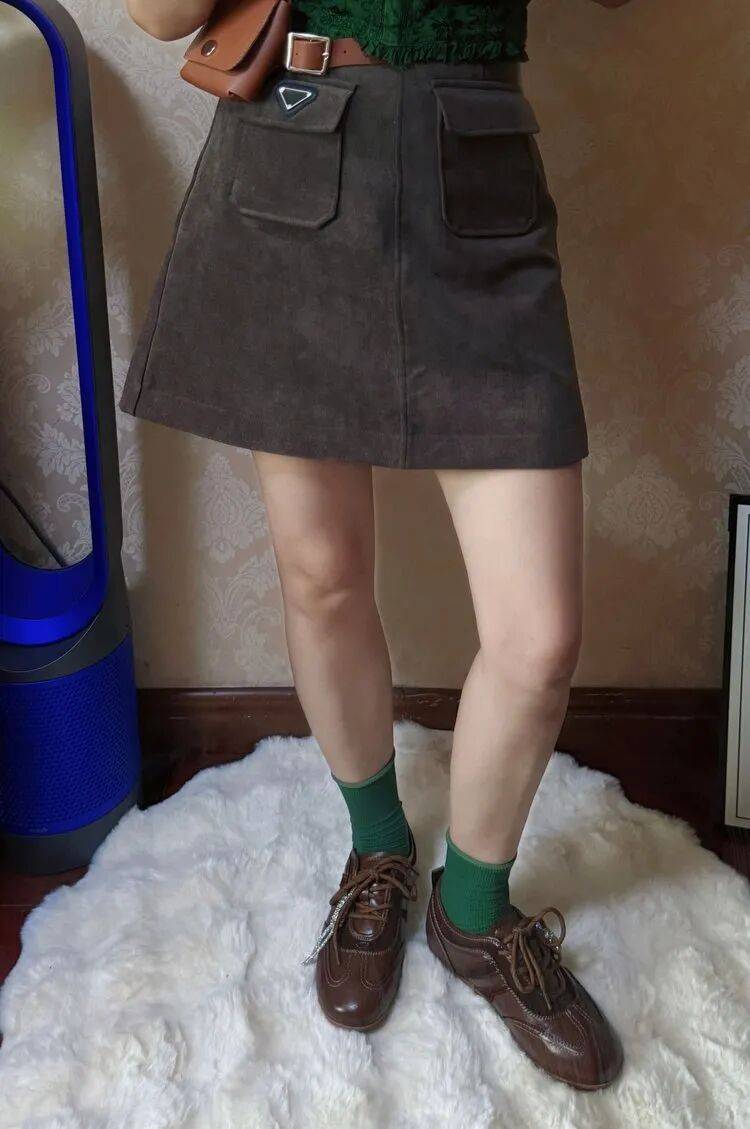 - 过膝半身裙:选择宽松款式遮挡腿部缺点,过膝不过踝的长度搭配高腰设计,修饰身材比例。圆头德训鞋与半身裙搭配,视觉上轻盈利落。