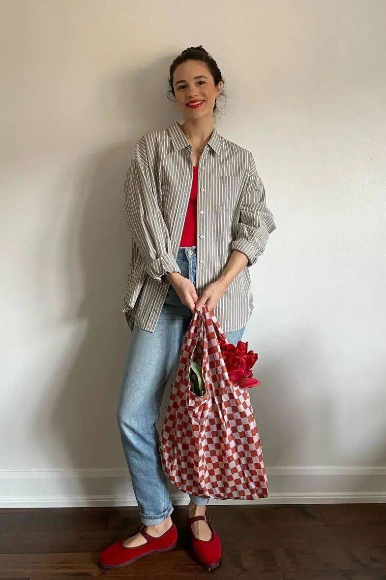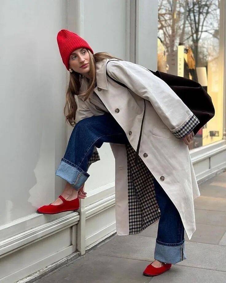 比如一身米白风衣配牛仔裤,脚下一抹酒红,既不突兀,又足够吸睛。