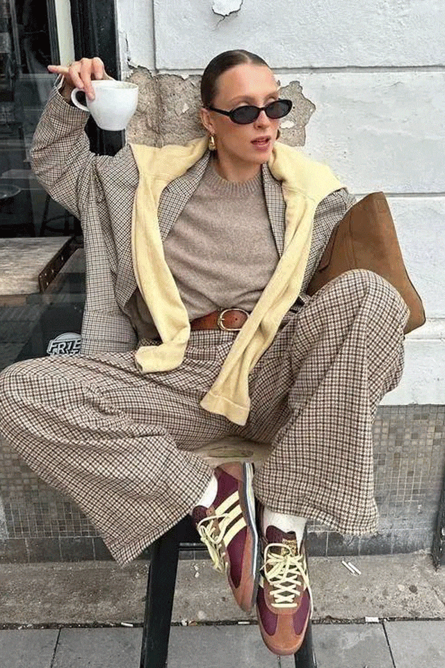 - 利用德训鞋的休闲属性中和西装的正式感。例如西装短裙+德训鞋+棒球帽,风格混搭却不突兀;西装长裤搭配德训鞋,则增添一丝随性与松弛感。