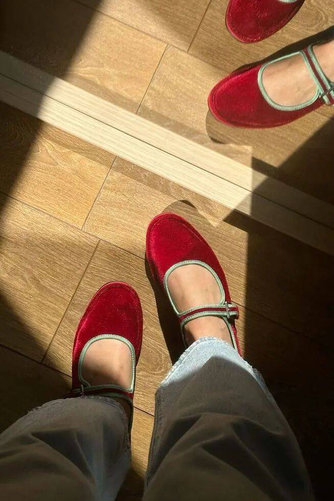 其中红色丝绒鞋最具代表性,轻轻一点,就能在平静的造型里点出暖意。