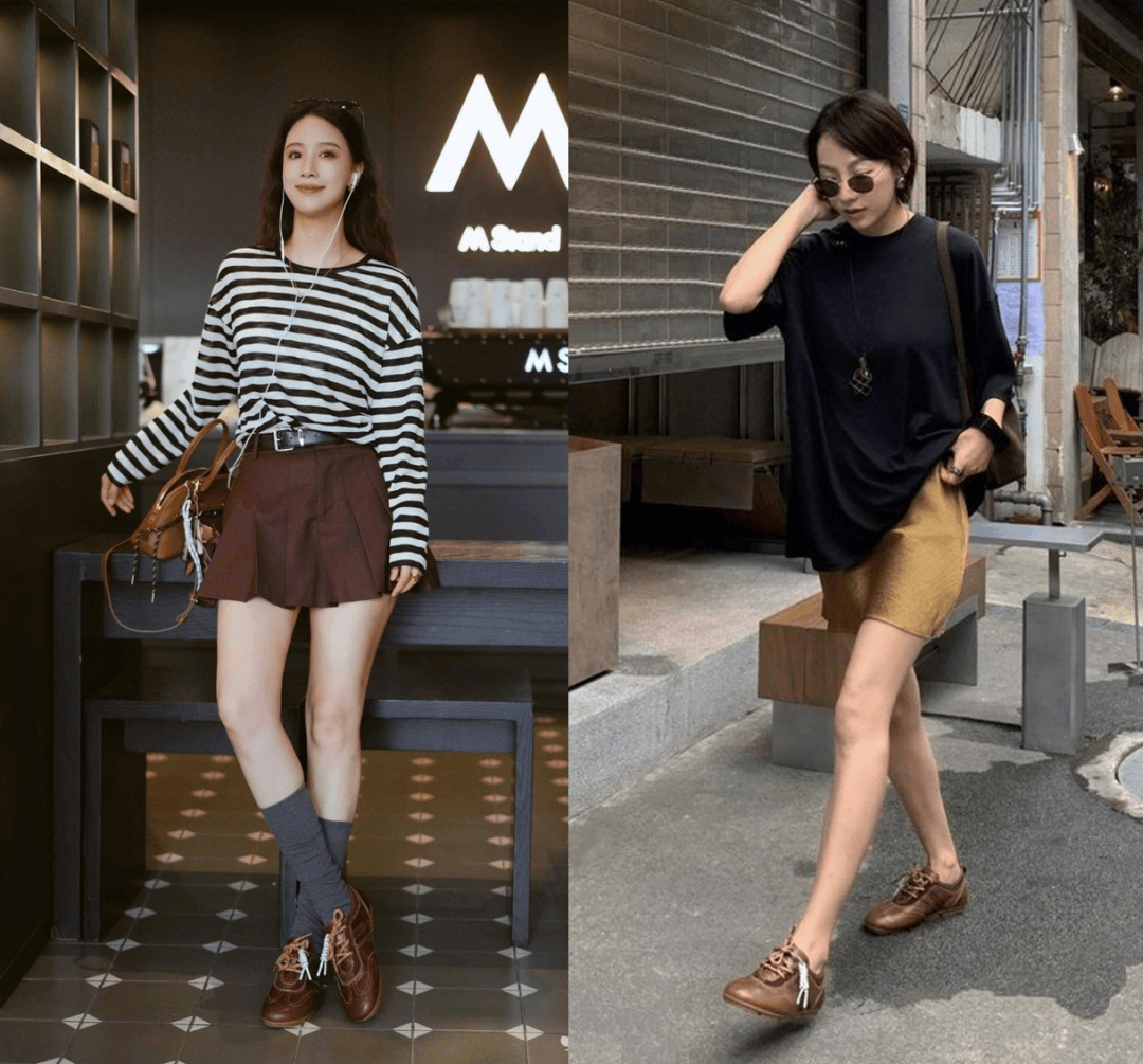 2. 德训鞋 + 半身裙:温柔与酷感并存