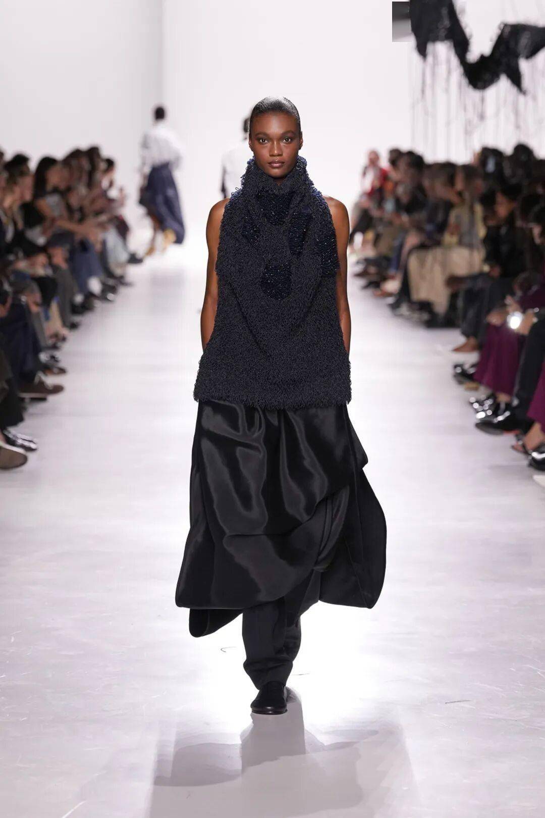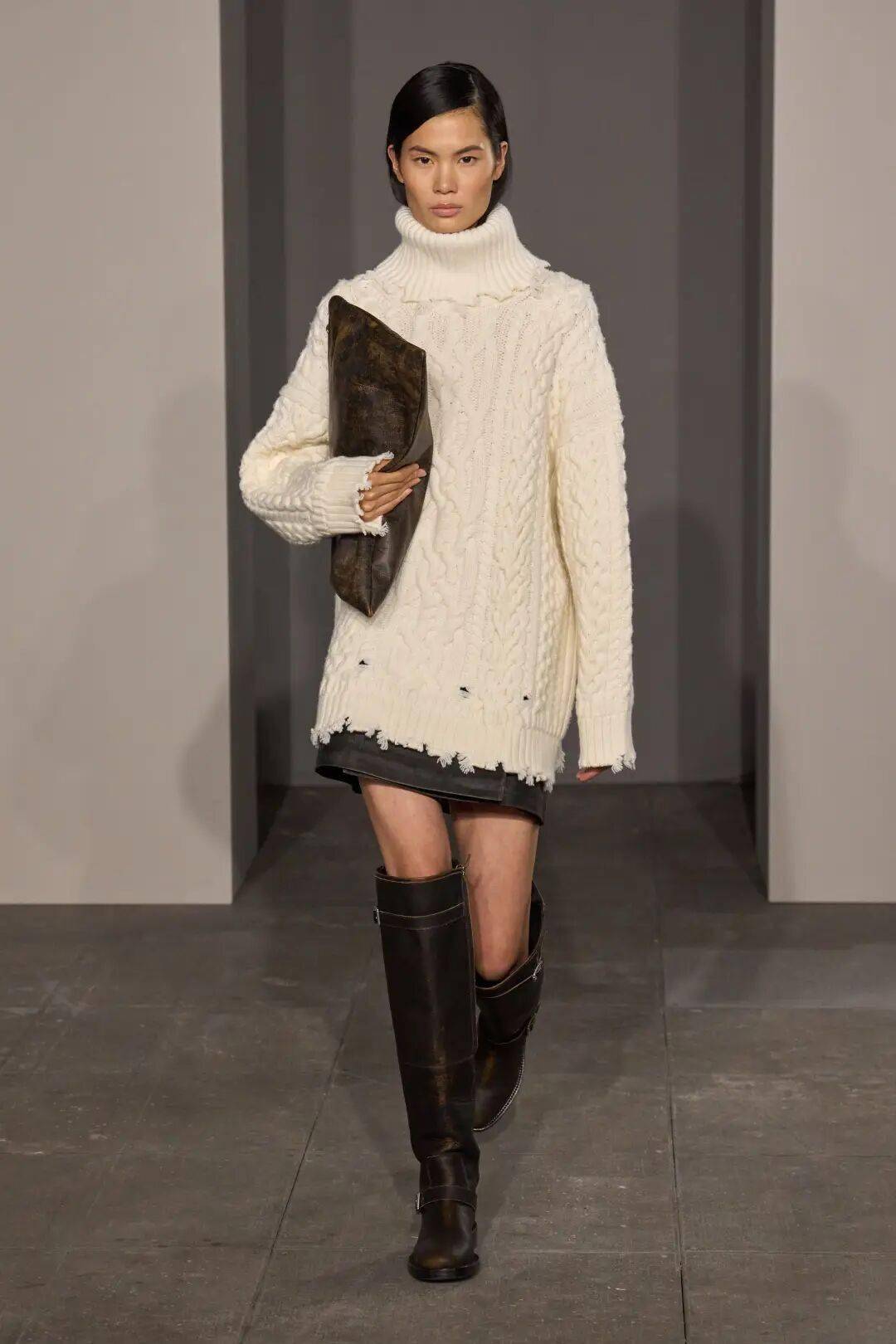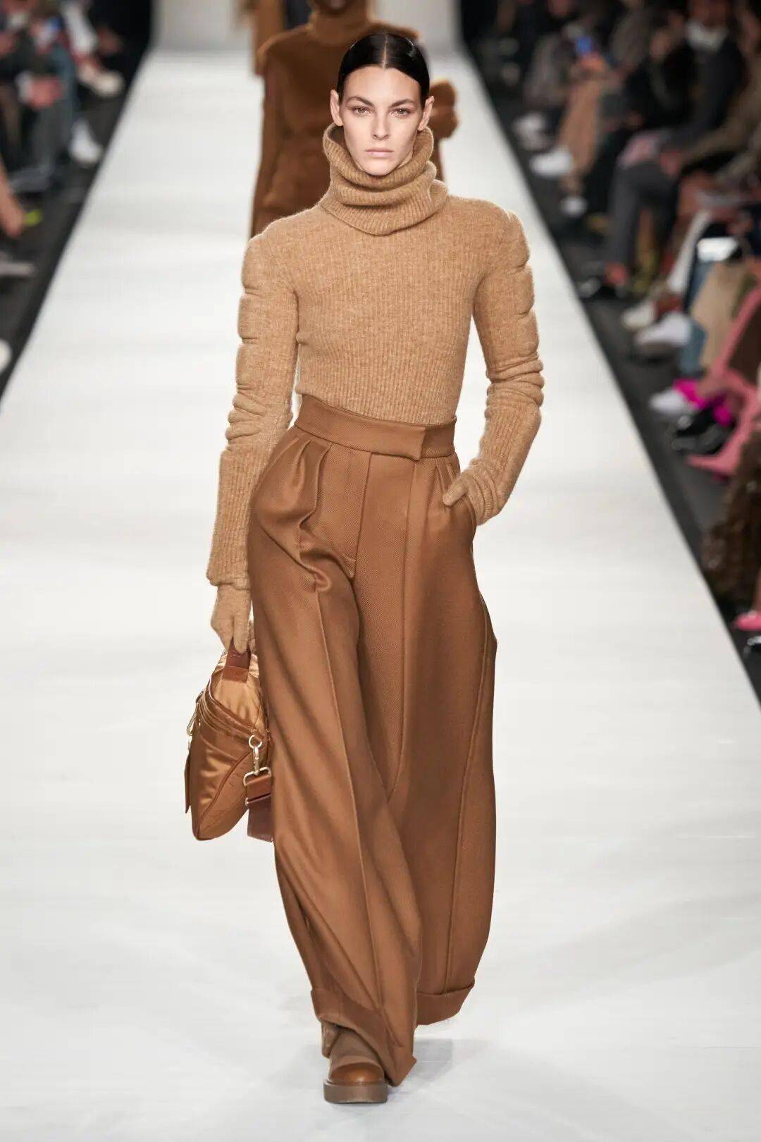 这一季的高领,超越了基础的打底功能,成为整体造型的视觉焦点。搭配oversize西装,它是不动声色的内敛底色;单穿时,搭配一条精巧项链,便在严谨的包裹中透出一线生动。正如Max Mara所示范的,高领的沉静并非封闭,而是一种从容笃定的姿态,是快节奏世界中难能可贵的温柔风骨。