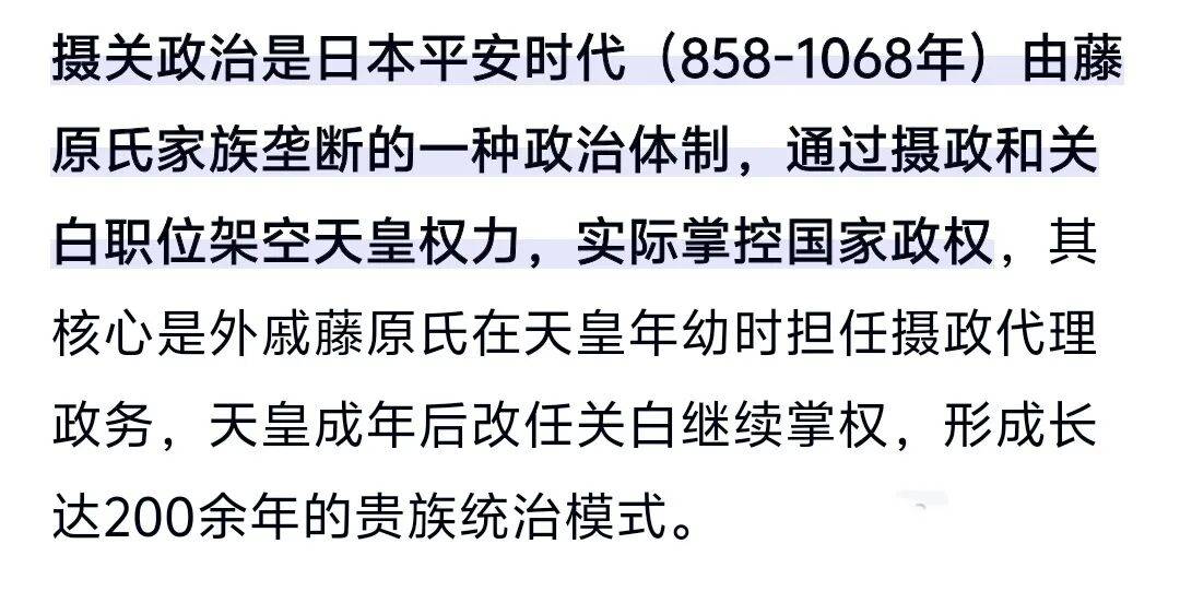 到9世纪中叶,由于天皇更替、新君年幼等因素,藤原氏垄断了“摄政”(天皇未成年时负责朝政)和“关白”(天皇成年后辅佐朝政)职位,形成了摄关政治并架空了天皇。