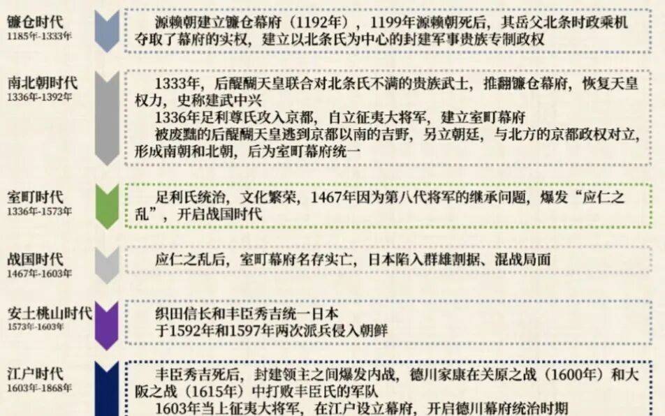 12世纪末到16世纪末,武士集团内部纷争不断,日本先后经历了镰仓、室町两个幕府时期。