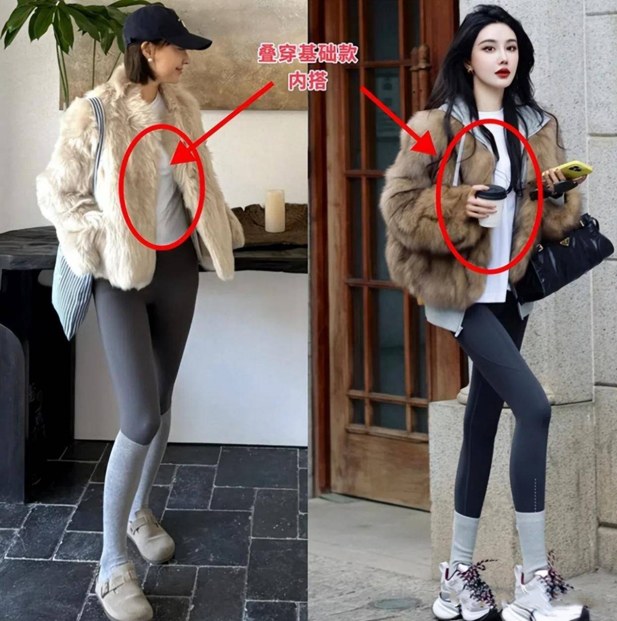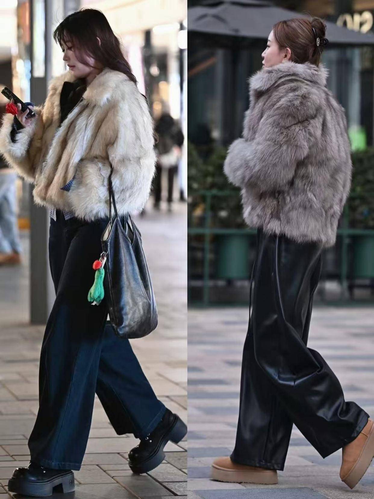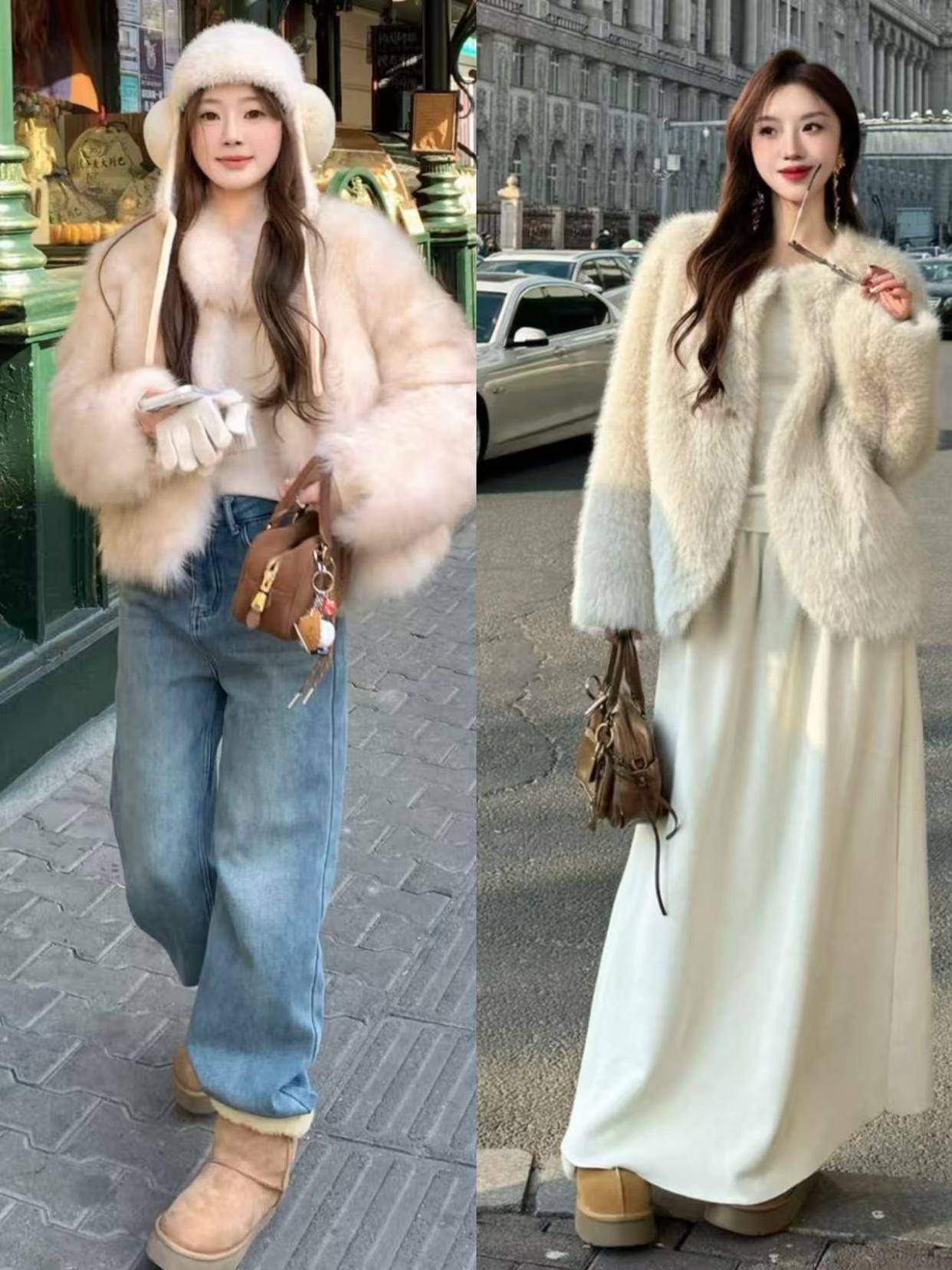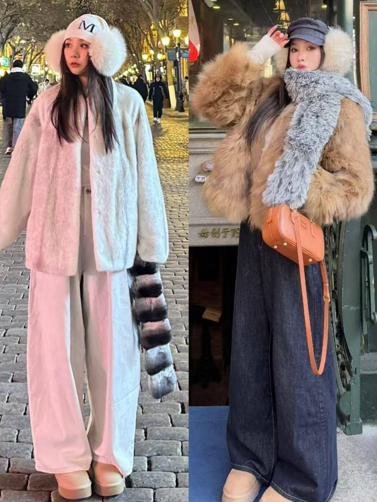 配色公式:基础色皮草(黑/棕/灰)搭配亮色内搭,或通过贝雷帽、金属链条包点缀提升精致度。