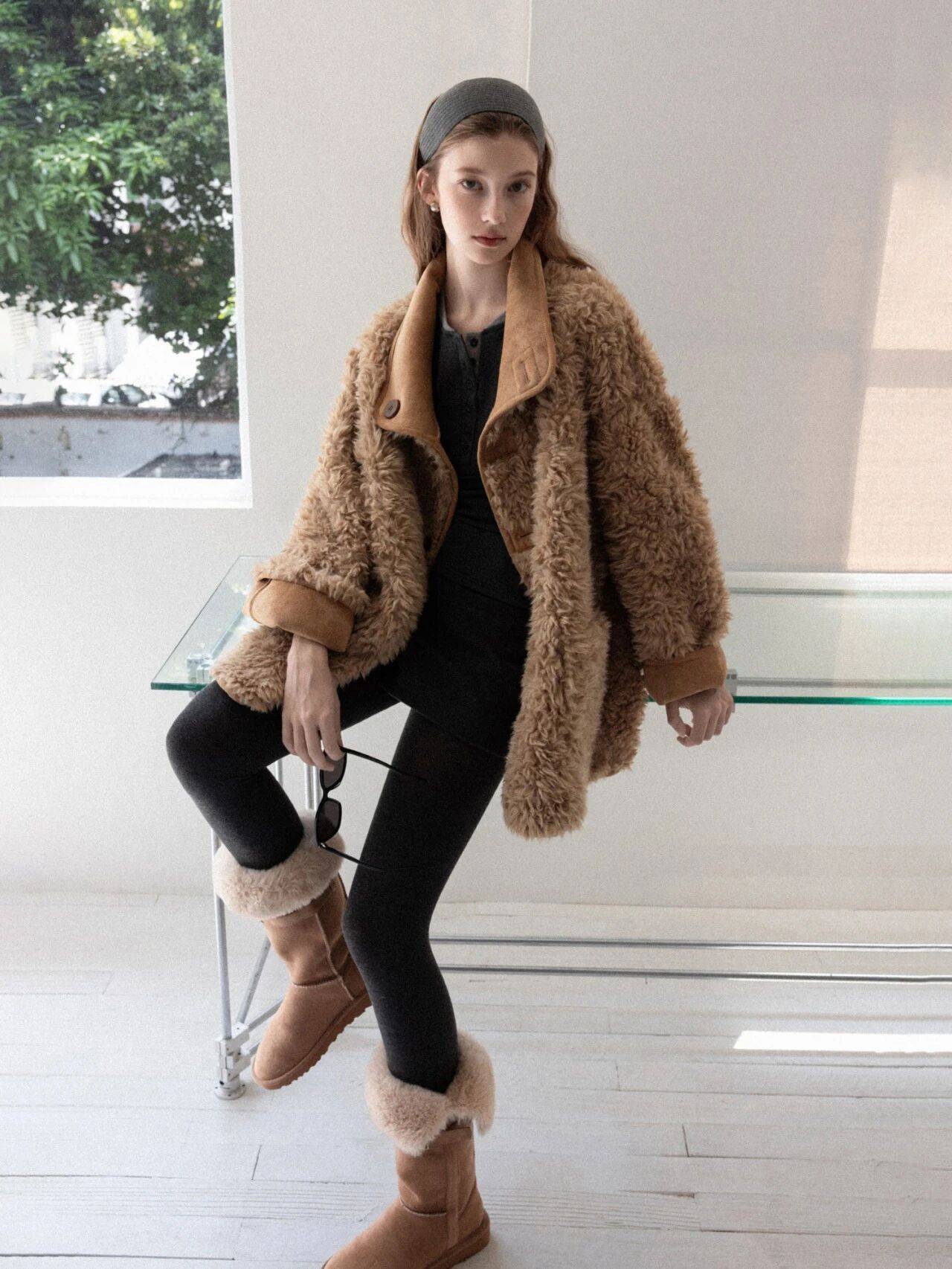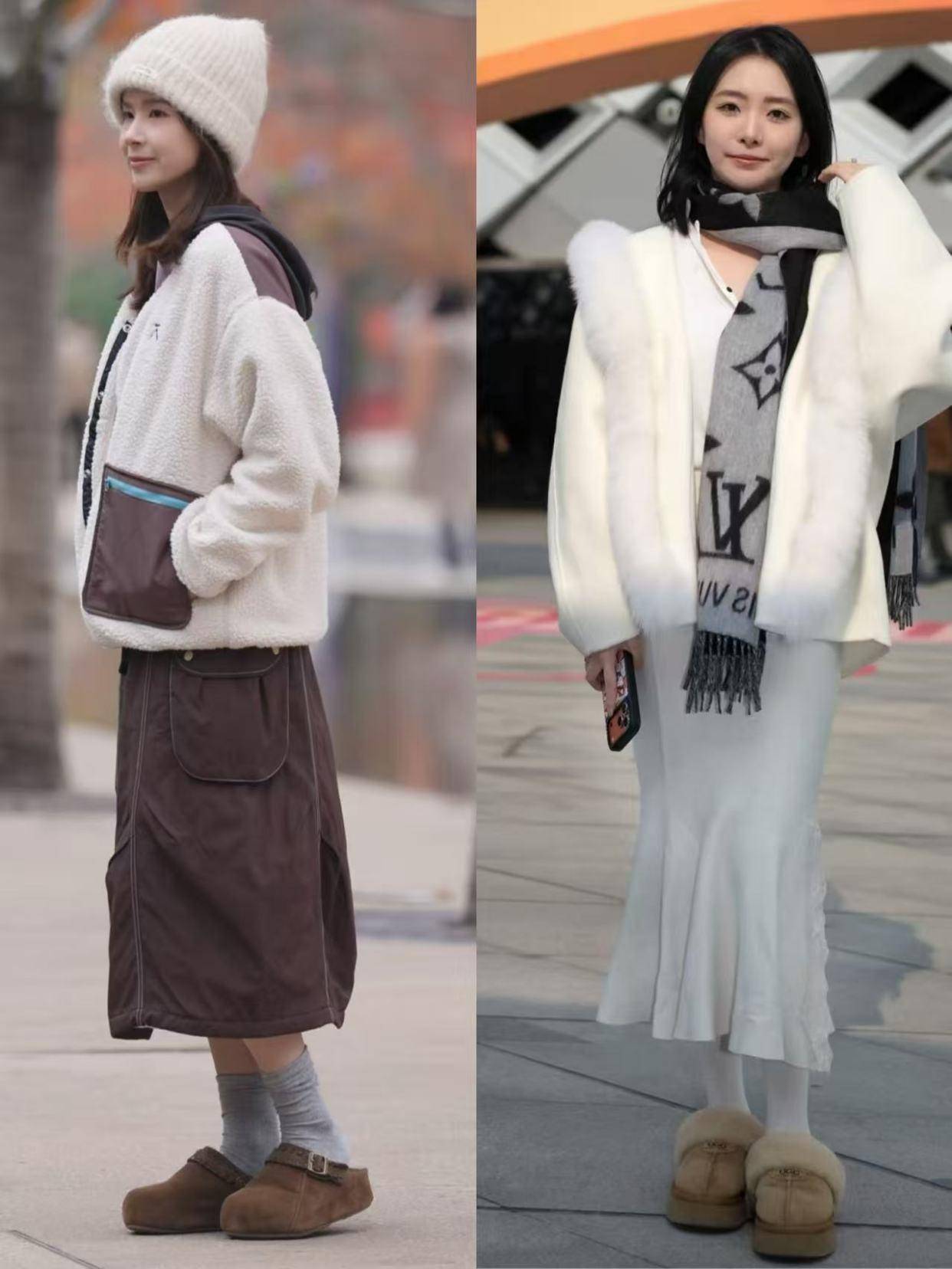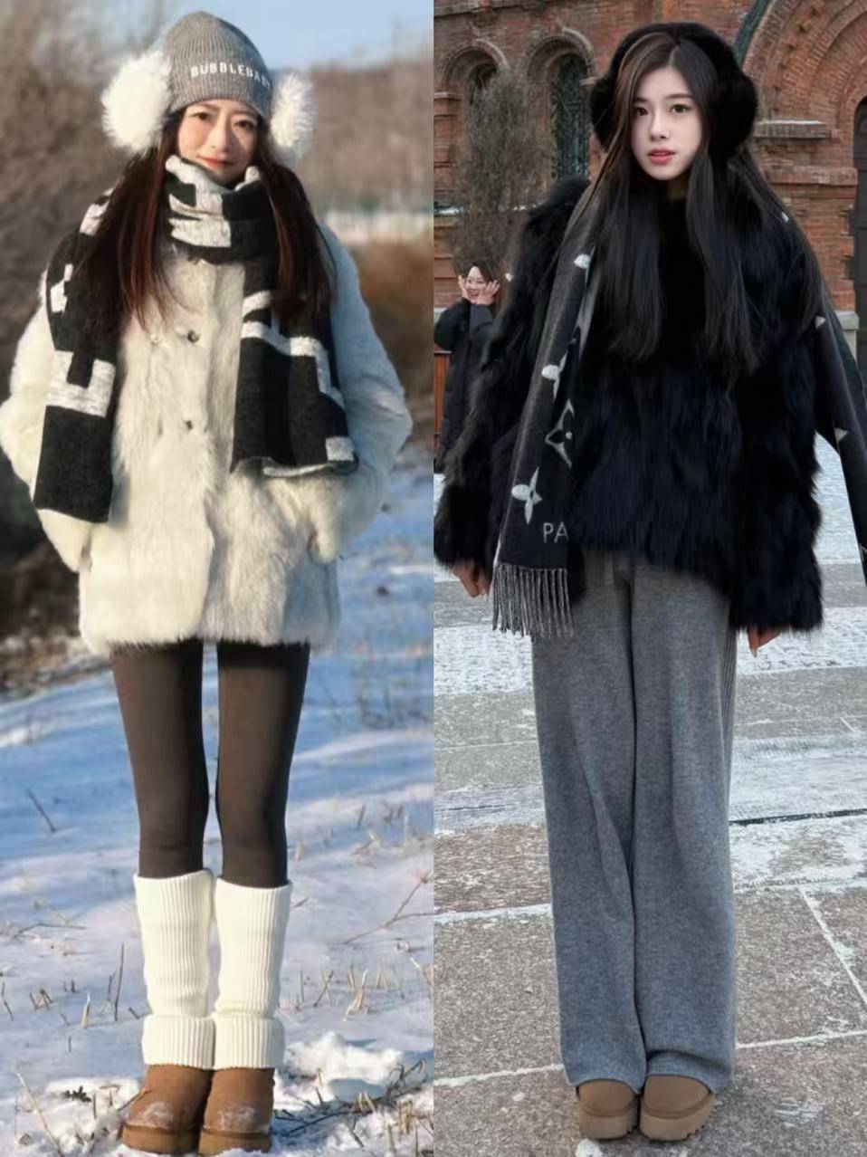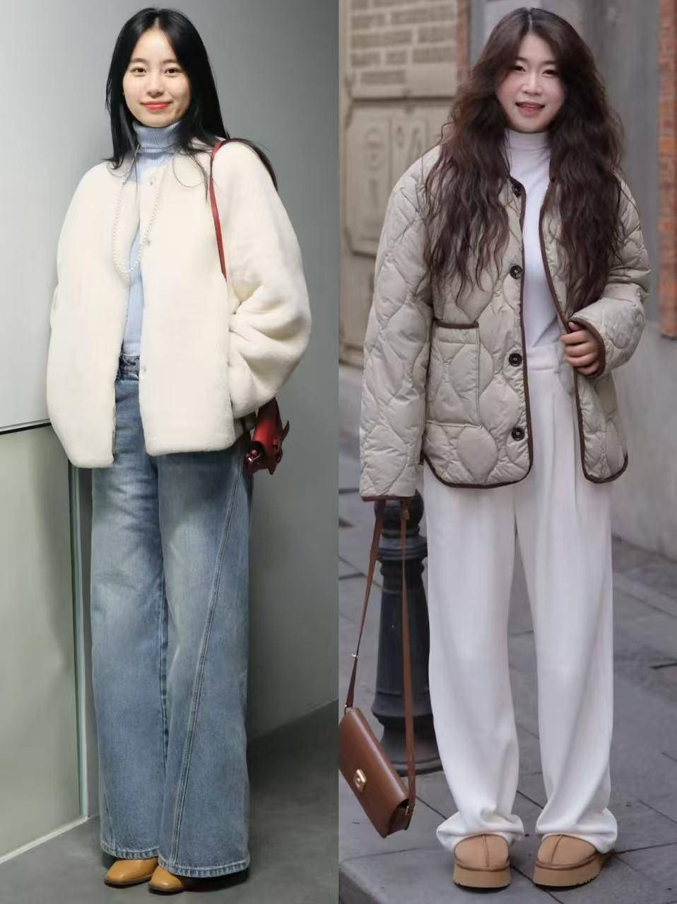 阔腿裤组合:选择高腰牛仔阔腿裤+厚底雪地靴,遮肉同时拉长比例。