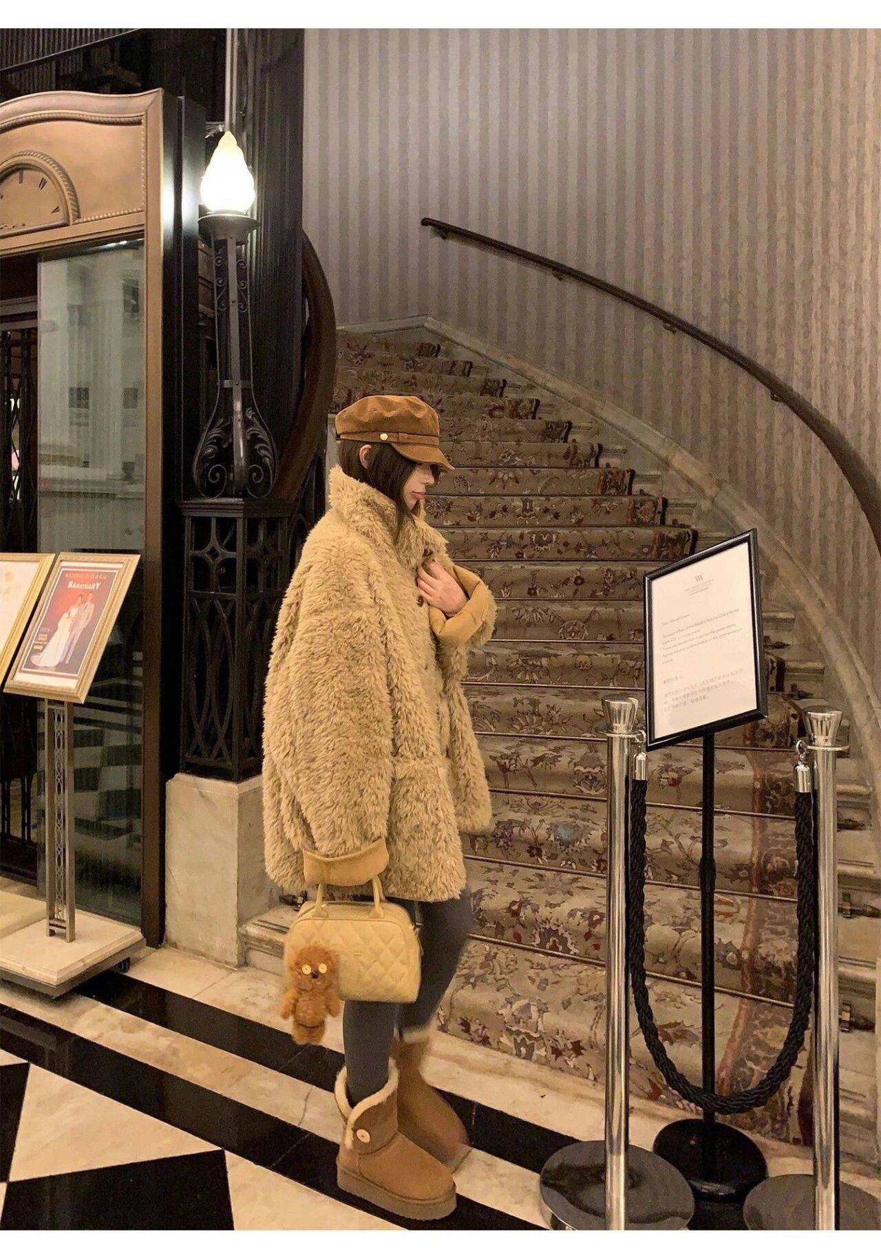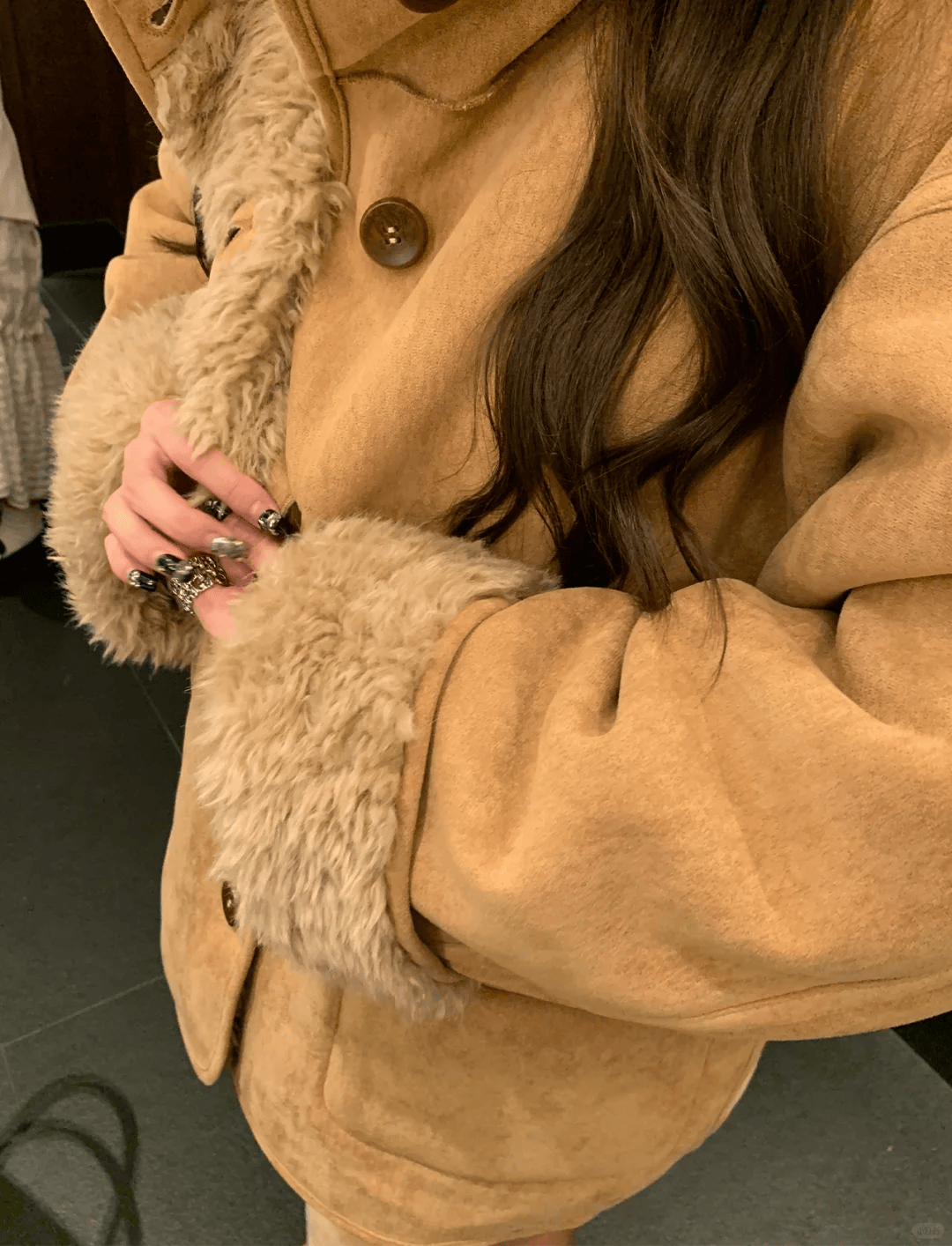 羊羔毛翻领、可拆卸毛领设计强化颈部保暖。