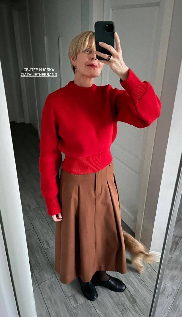 橘红针织+米白伞裙