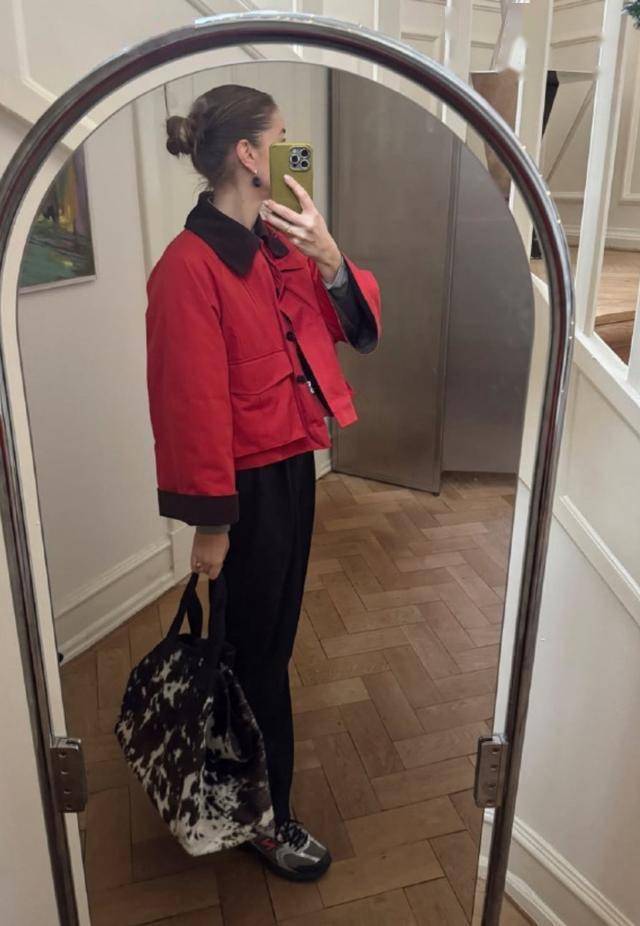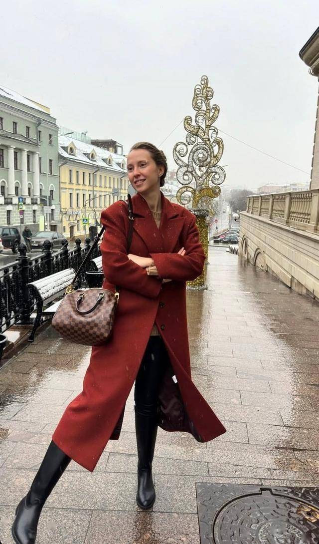垫肩款式的红色大衣,只需要配条小黑裤,踩双长靴,便可以美成焦点!