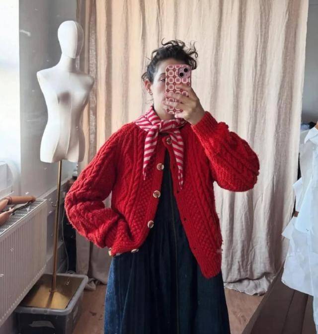 粗针织红毛衣外套,堪称冬日“温暖王者”,保暖效果拉满,只系领口一颗纽扣,内搭A字连衣裙,慵懒感十足。