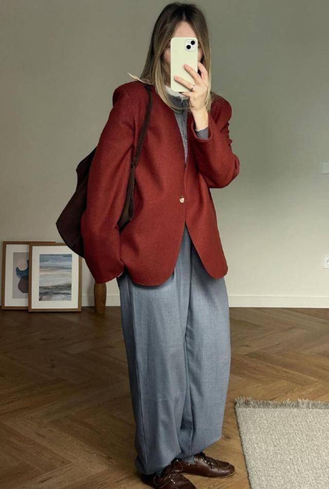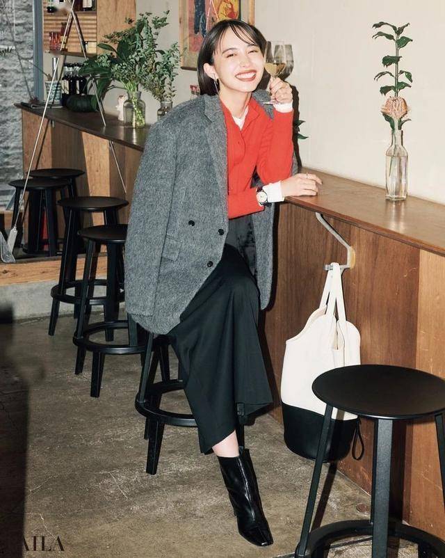 红西装配灰色阔腿裤,背款托特包,别提多有范儿了~