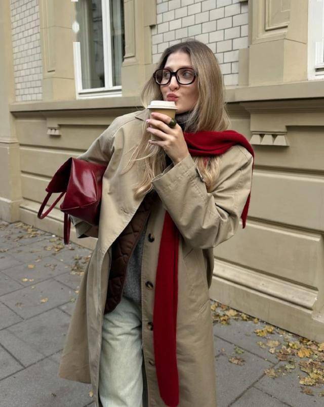 红围巾可以解决冬日穿搭痛点,让原本平平无奇的造型,更具吸引力,成功凝聚视觉焦点,甩掉平庸感。