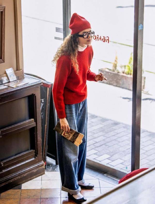 基础款式的红毛衣,需要借助牛仔裤提升时尚感,裤腿挽起来穿,利落又显高。