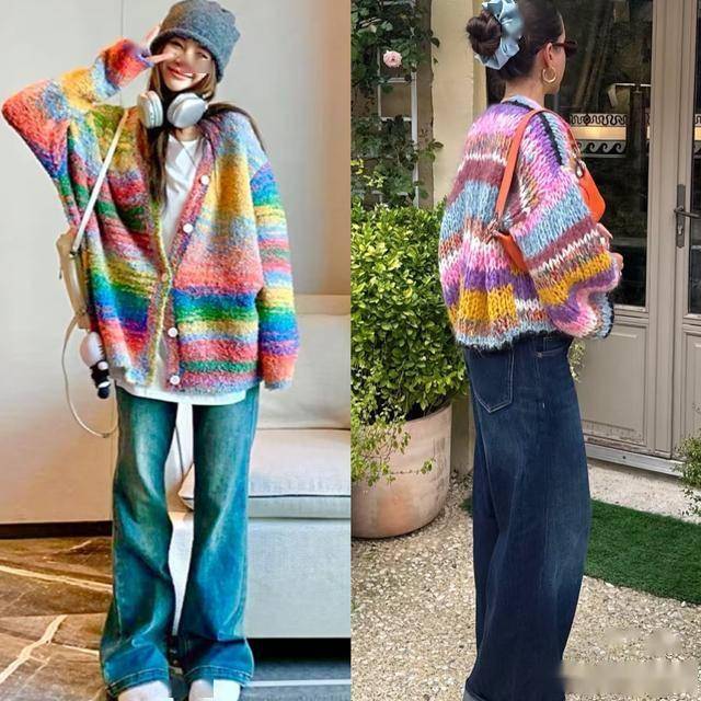 低饱和度的雾蓝色毛衣,配黑色老爹裤、灯芯绒直筒裤、牛仔阔腿裤,通通都很美~