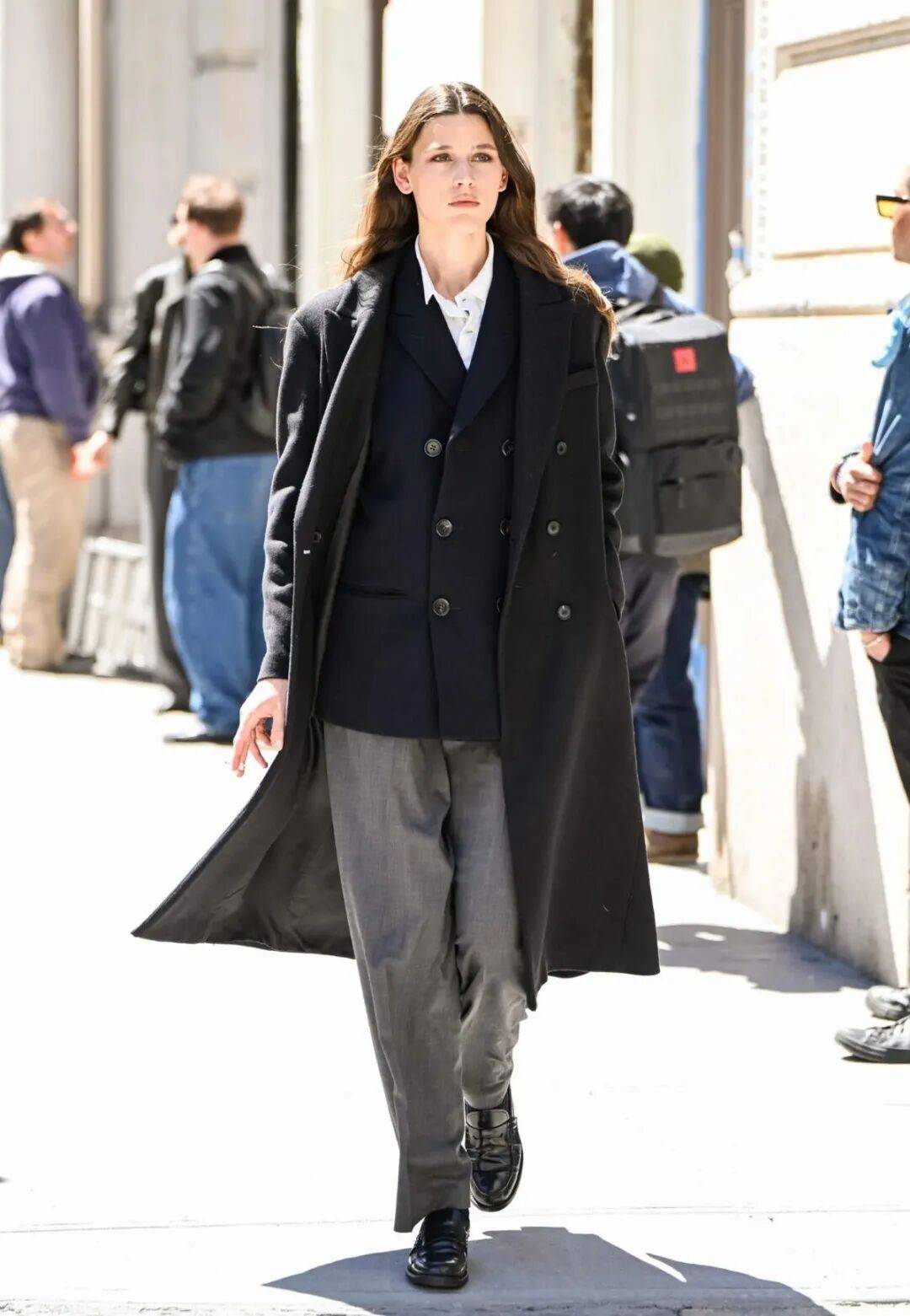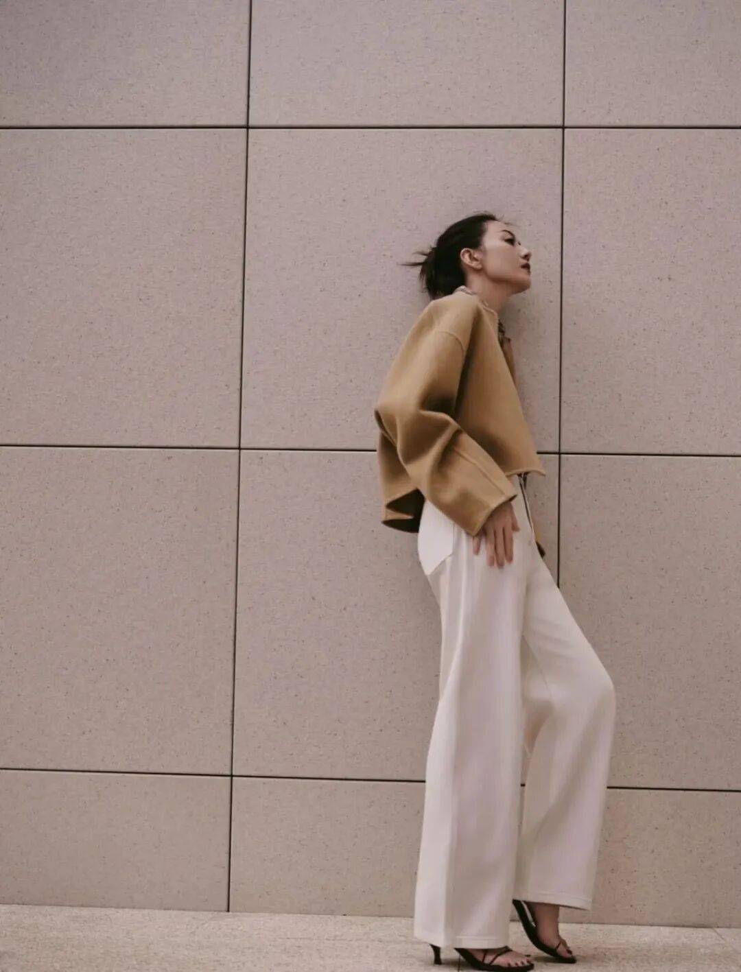 短款箱型大衣的辨识度极高,利落的肩线、直上直下的宽松版型,下摆通常在髋部附近利索收住。