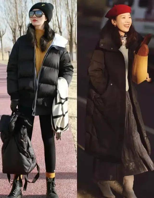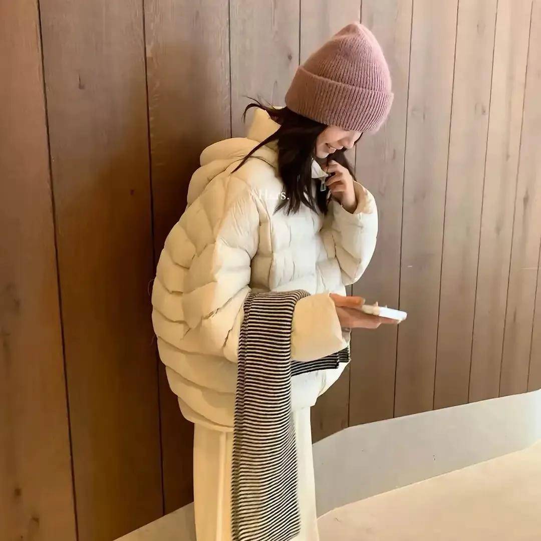 当然,咱们也可以选择杏色的羽绒服,内搭藏蓝色的 V 领打底衫,加上一条白色的 A 字半身裙,脚穿黑色短靴,这样的穿搭保暖优雅,还可以采用“上宽下宽”的搭配方式,局部露肤,确实更修身。