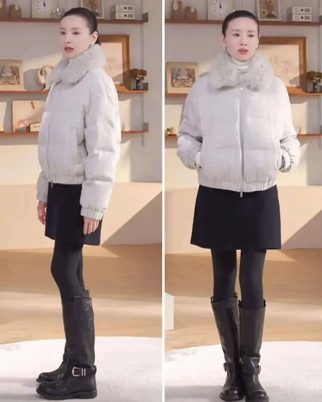 黑色的羽绒服搭配白色的裙子,脚穿黑色中筒靴,黑白色彩搭配经典耐看更出彩。
