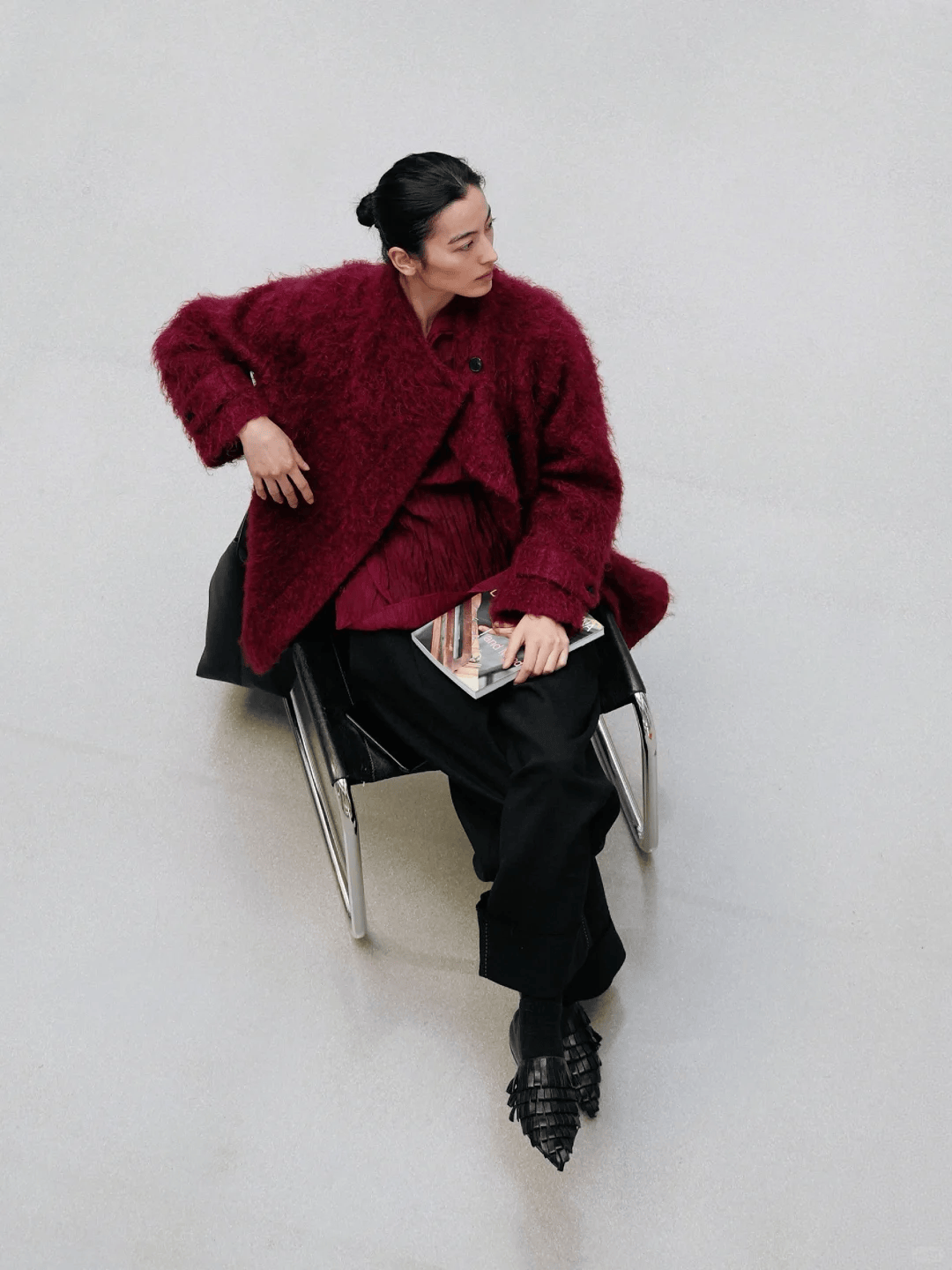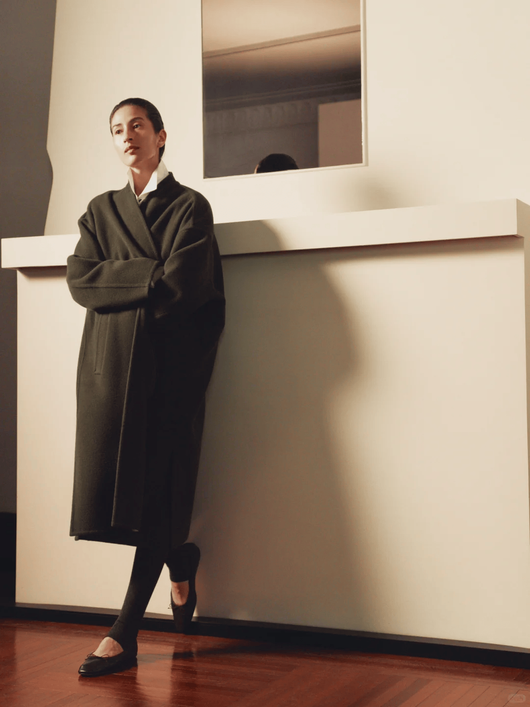 落肩款大衣+烟管领内搭,颈部留白拉伸视觉,替代传统V领。