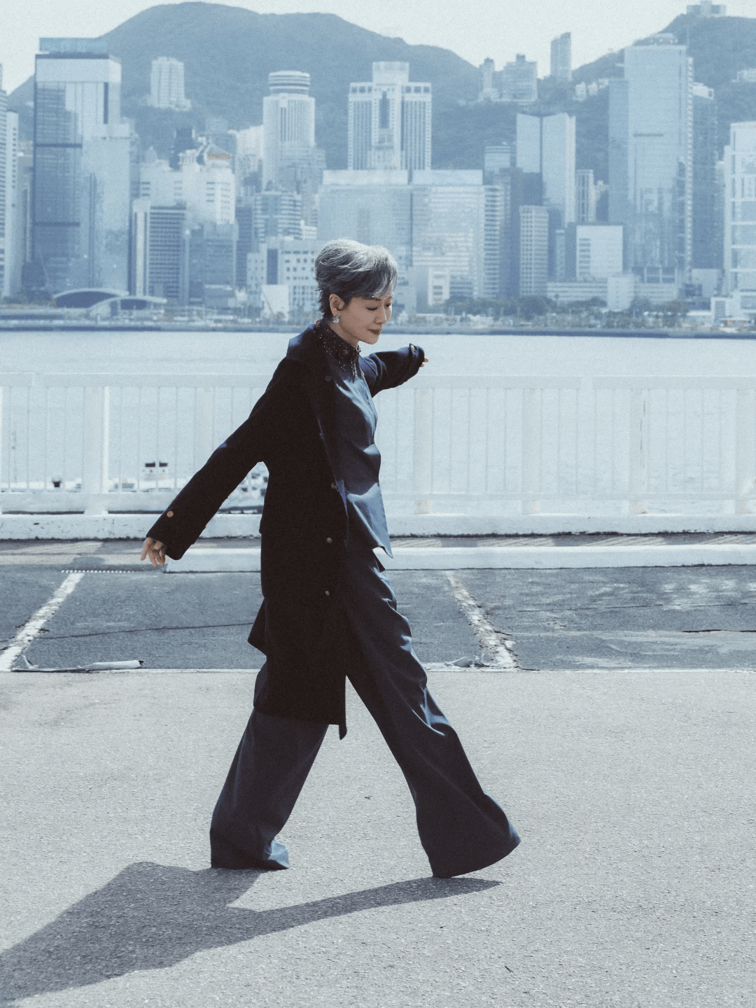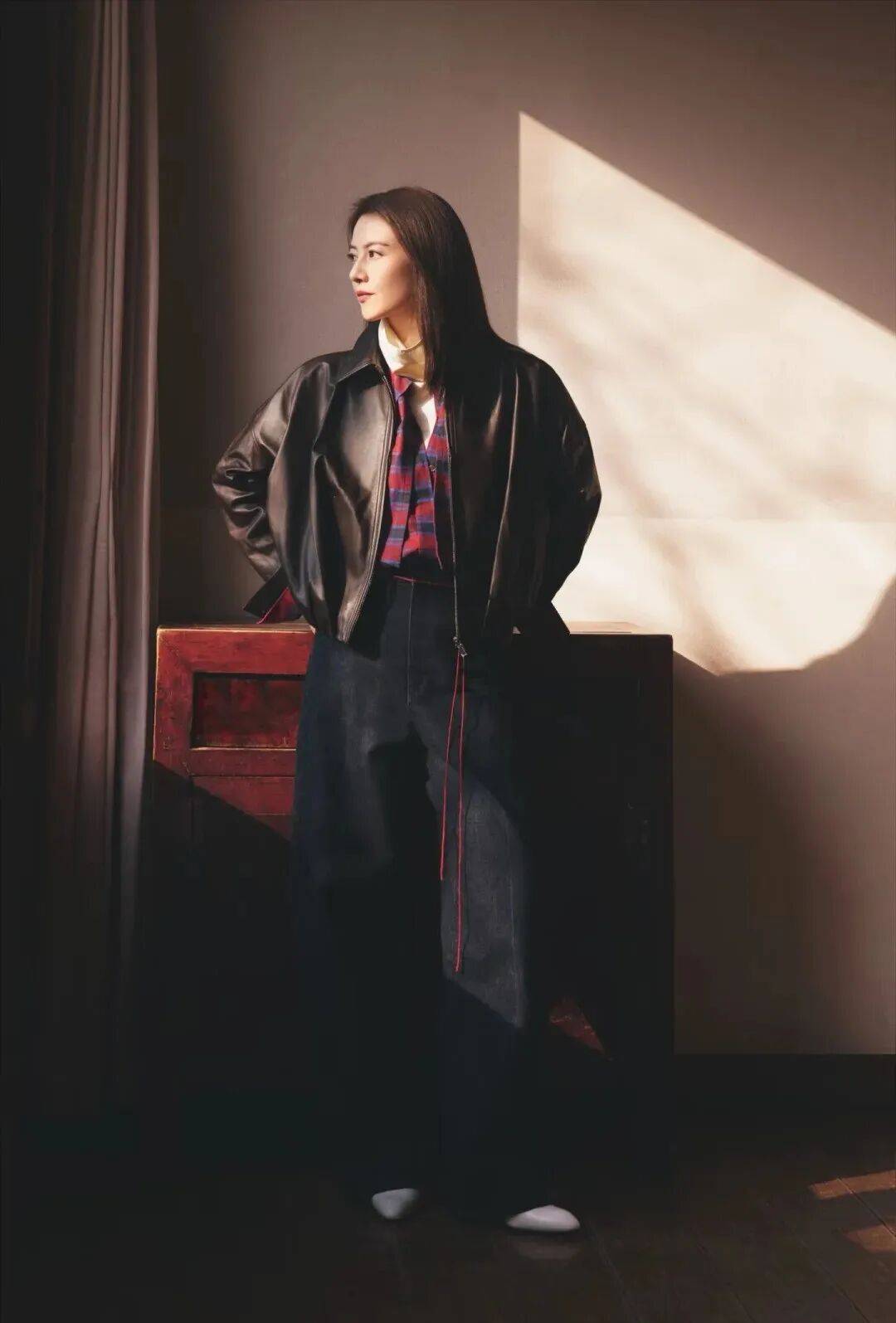 灰渐变丝巾点缀脖颈,既提亮肤色又不破坏整体淡雅基调。