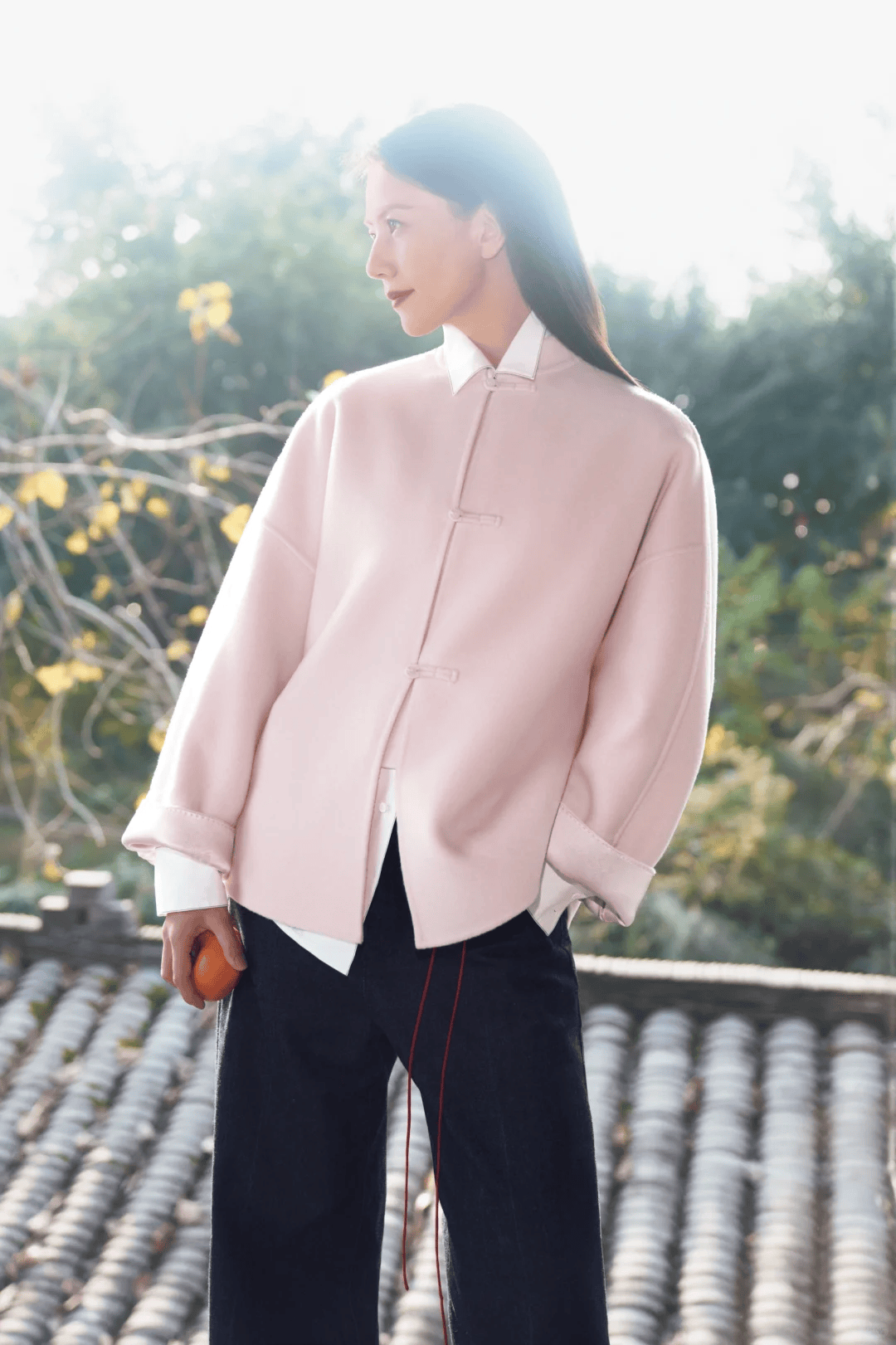 羊绒大衣+缎面衬衫内搭,袖口微露光泽边沿。